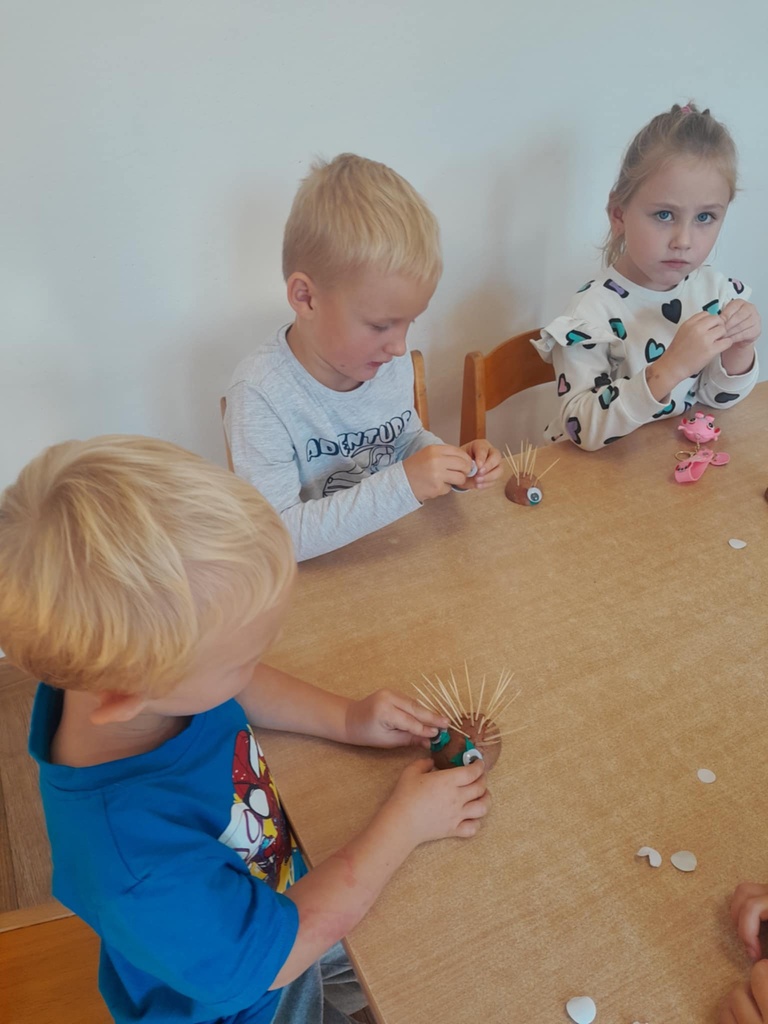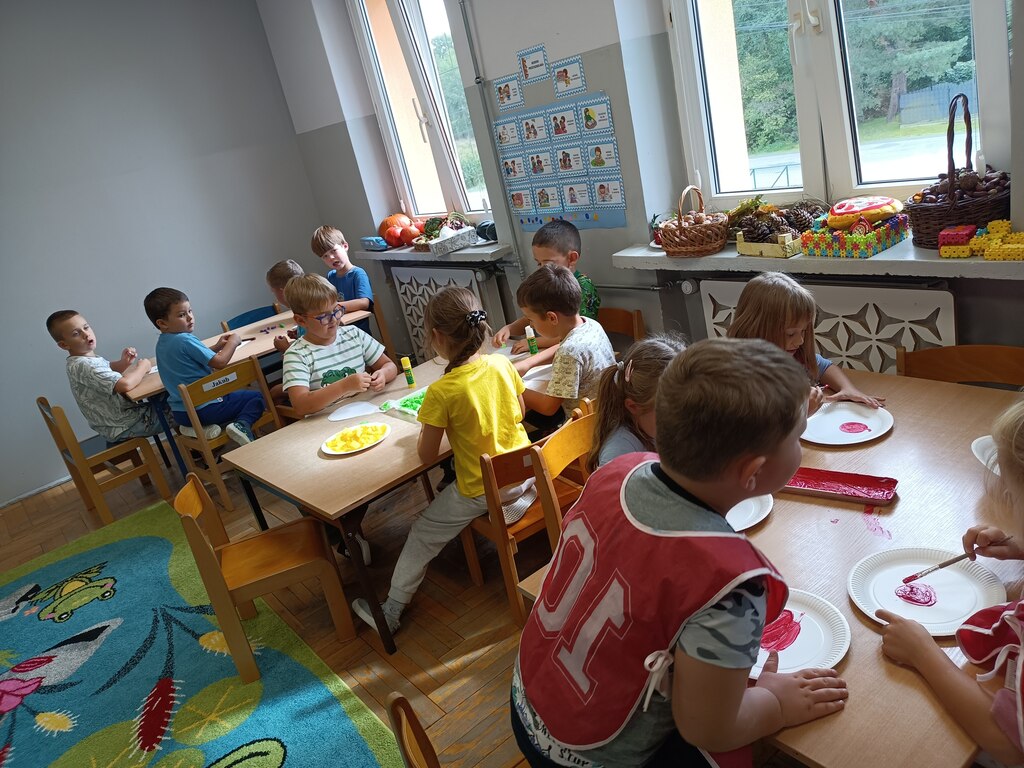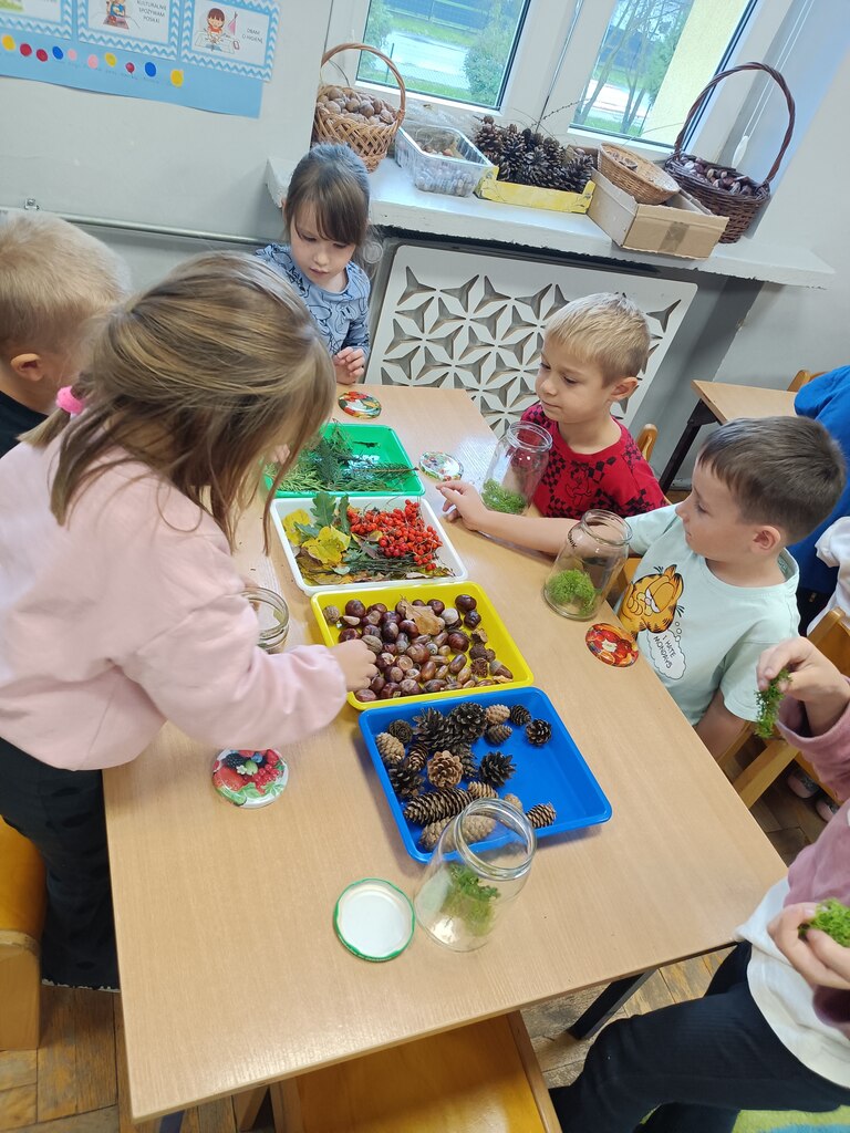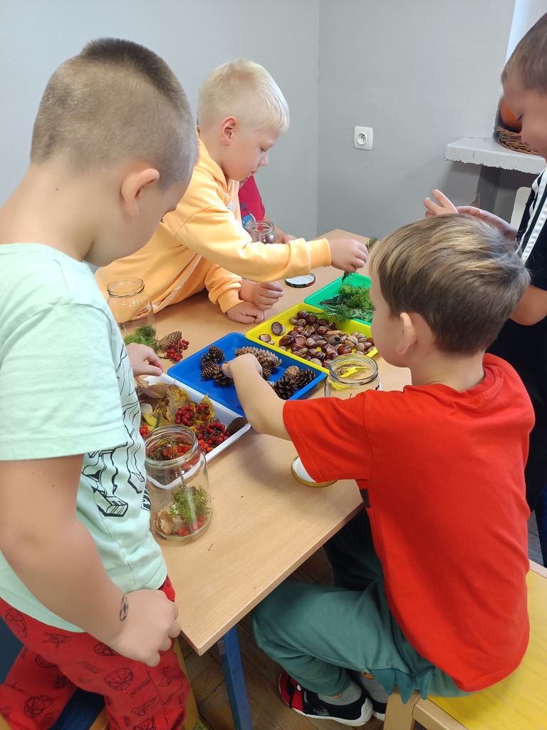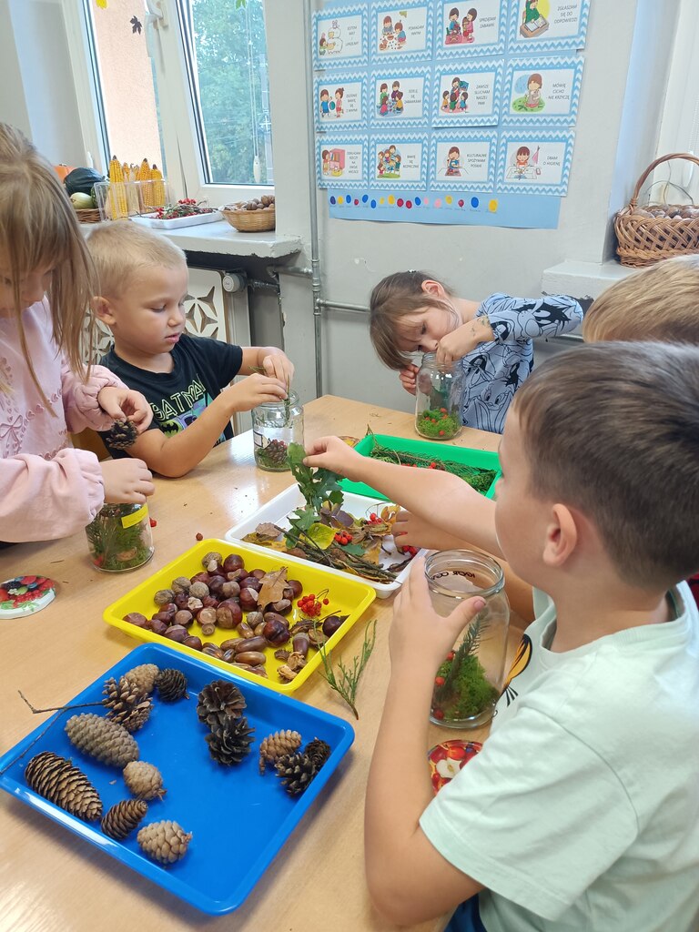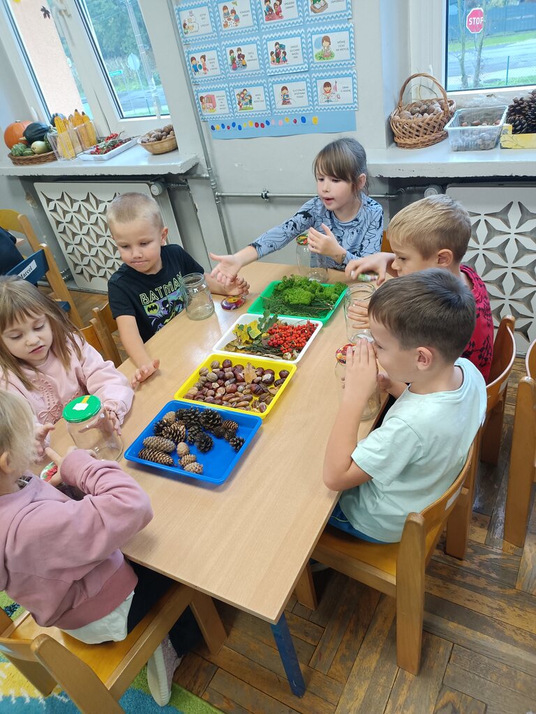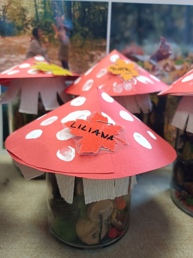 Jesień rozgościła się u nas na dobre. Przedszkolaki w ostatnim czasie pomogły jej zadomowić się w przedszkolu – dzieci nie tylko „przyprowadziły” jesień do sali, zbierając jej dary 🍎🍂, ale też wykorzystały je kreatywnie w różnych aktywnościach. Powstała m.in. ścieżka sensoryczna 👣, „Jesień w słoiku” zamknięta w muchomorku 🍄, oraz różne prace plastyczne🎨 , a nawet tworzyliśmy leśne zwierzątka, takie jak jeżyki 🦔 i pajączki 🕷️. Wszyscy świetnie się przy tym bawiliśmy!