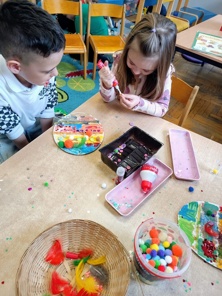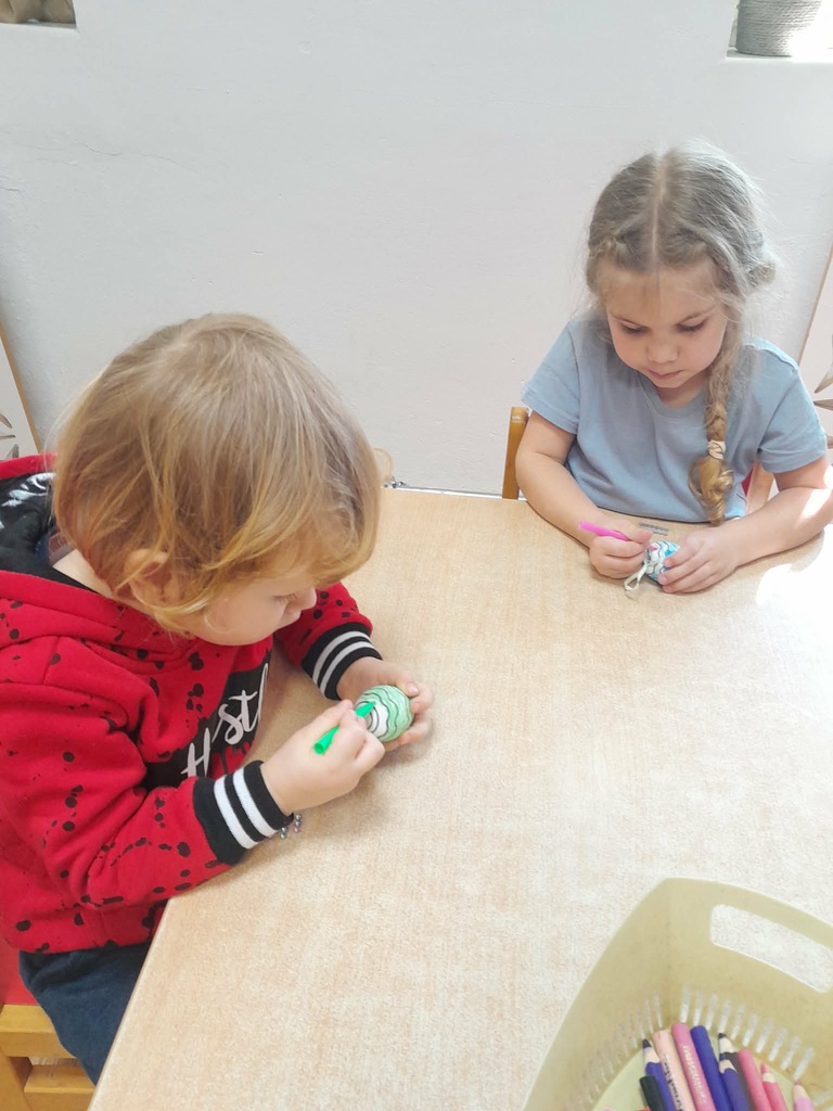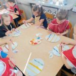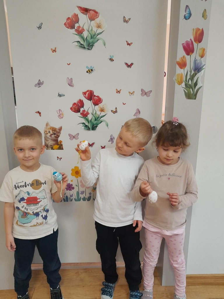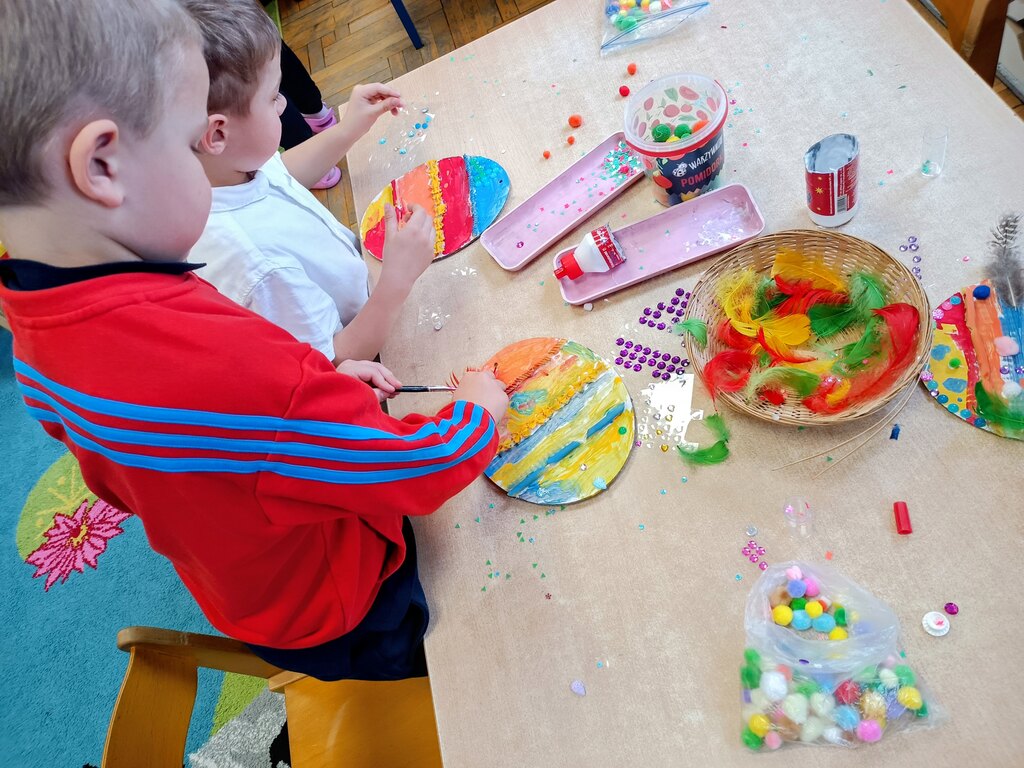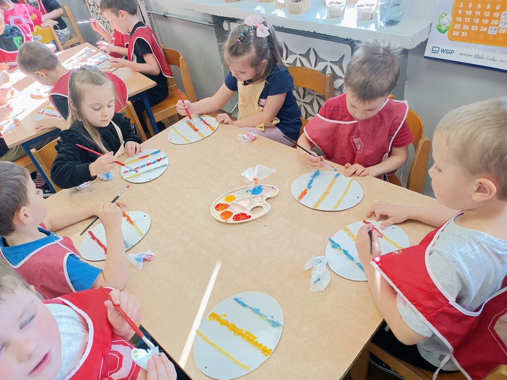 Przygotowania do Wielkanocy były w naszym przedszkolu czasem radości i wspólnej zabawy. Dzieci z zaangażowaniem tworzyły świąteczne prace plastyczne – pisanki i kolorowe dekoracje. Wspólnie zasialiśmy także rzeżuchę, o którą codziennie dbaliśmy.