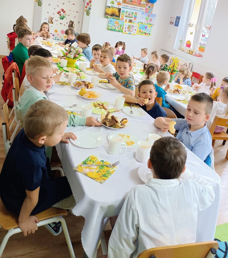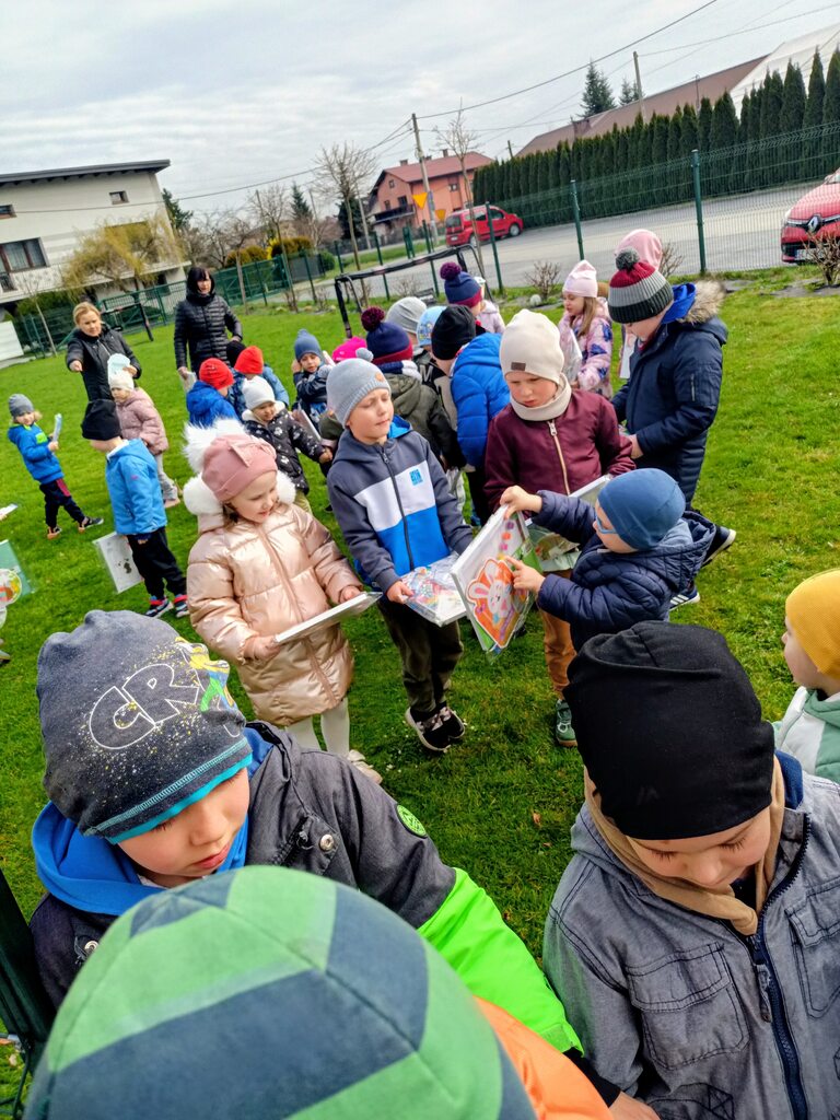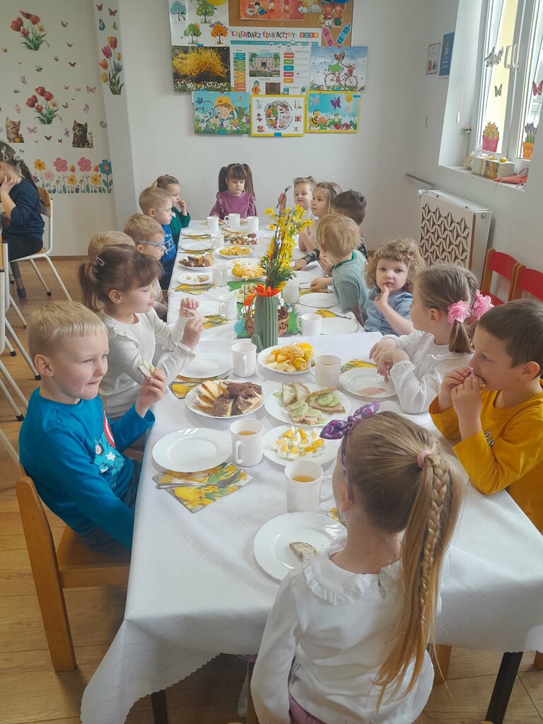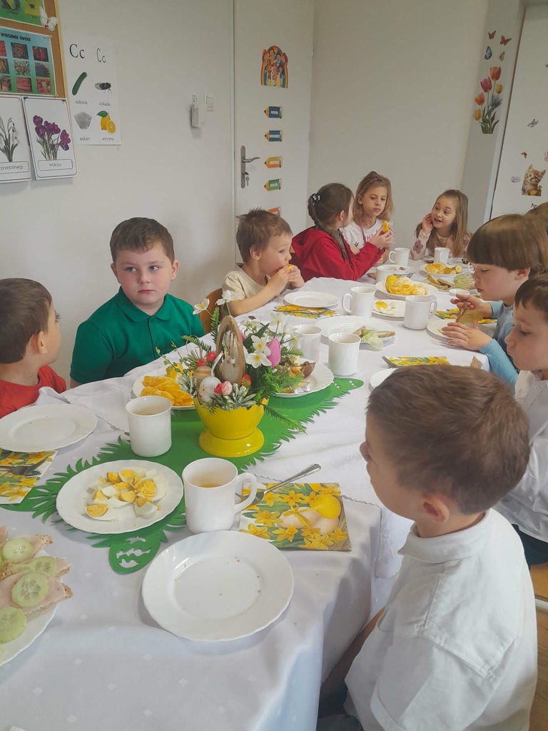 W czwartek zasiedliśmy do wspólnego śniadania wielkanocnego. Było bardzo uroczyście – śpiewaliśmy piosenki, mówiliśmy wierszyki z pokazywaniem oraz rozmawialiśmy o wielkanocnych symbolach i tradycjach. Po śniadaniu dzieci z niecierpliwością czekały na zajączka, dlatego wybraliśmy się do ogrodu przedszkolnego. Tam rozpoczęło się poszukiwanie prezentów – każdy przedszkolak znalazł swój upominek, co wywołało wiele radości i uśmiechów.