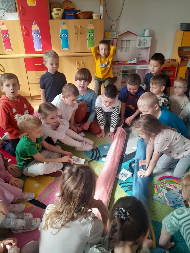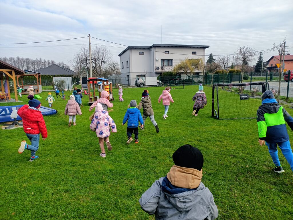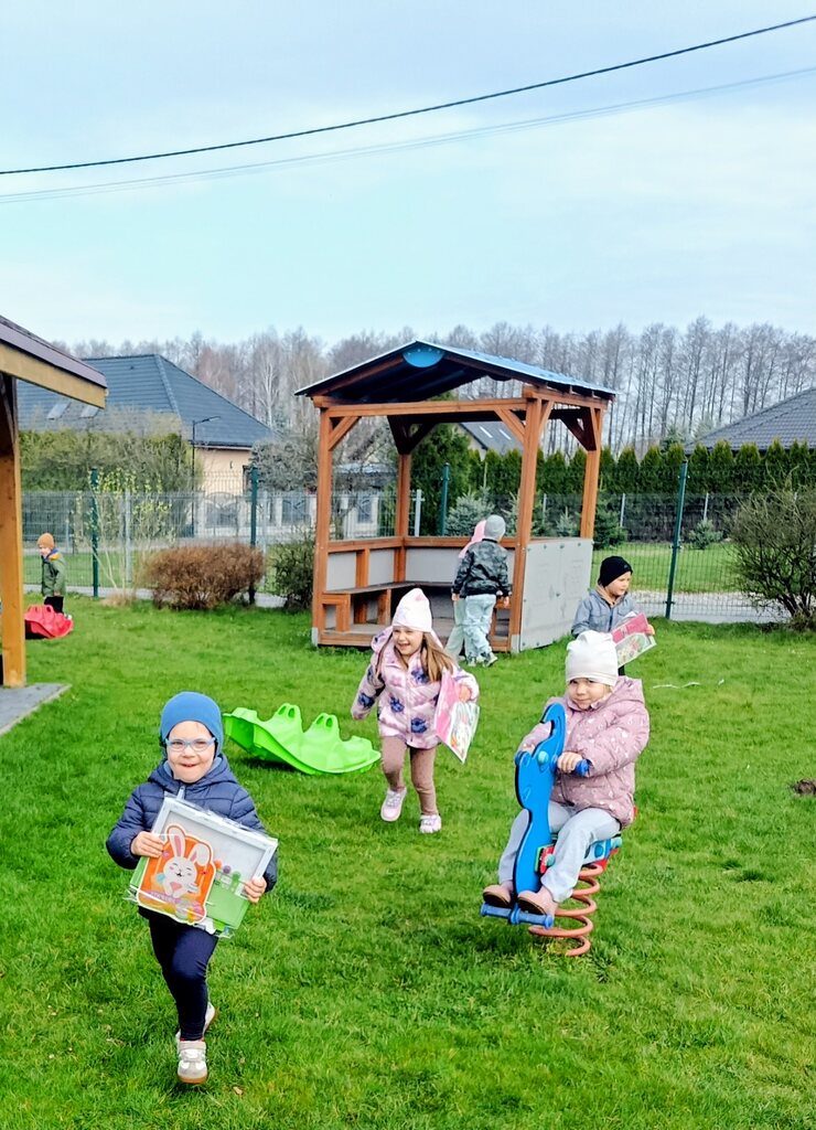 Po powrocie do przedszkola czekała na nas kolejna niespodzianka. Usłyszeliśmy tajemnicze kicanie, a po otwarciu drzwi zobaczyliśmy nowe zabawki: kuchenkę do ogrodu, namioty oraz sprzęt do zabaw ruchowych.