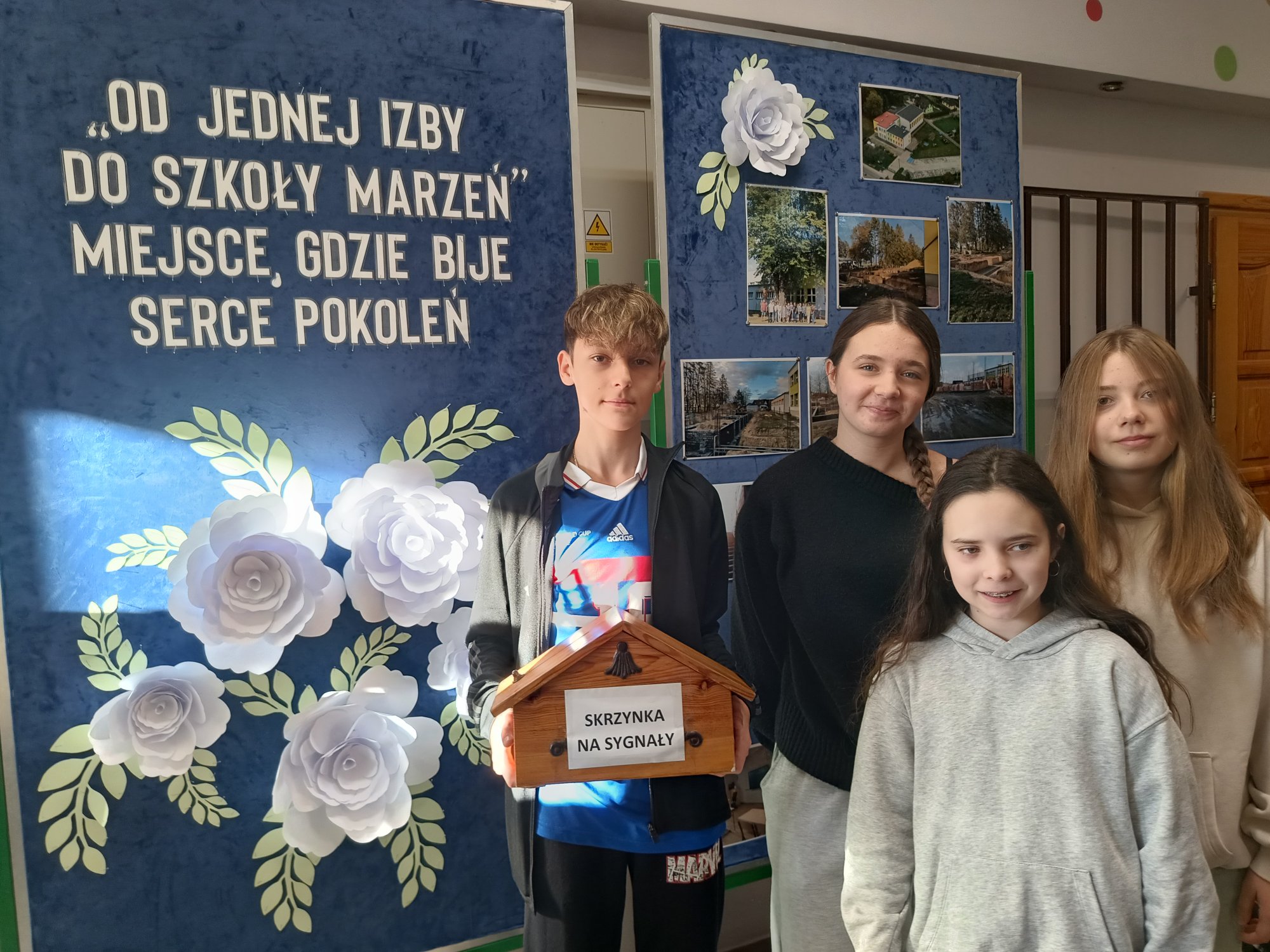 „Skrzynka na sygnały” znajduje się na parapecie w korytarzu dolnym w starej części szkoły.