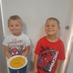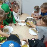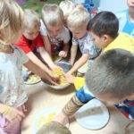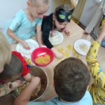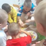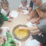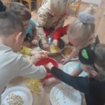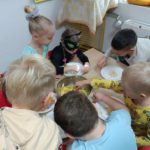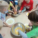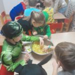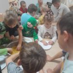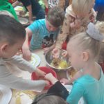 W dalszej części dnia dzieci uczestniczyły w zabawach muzyczno-ruchowych oraz wzięły udział w bajkowych stacjach zadaniowych. Jedną z nich była np. „Kopciuszek”, który musiał oddzielić i posegregować makaron, fasolę i groch – zadanie wymagało skupienia i cierpliwości! 🫘🍝