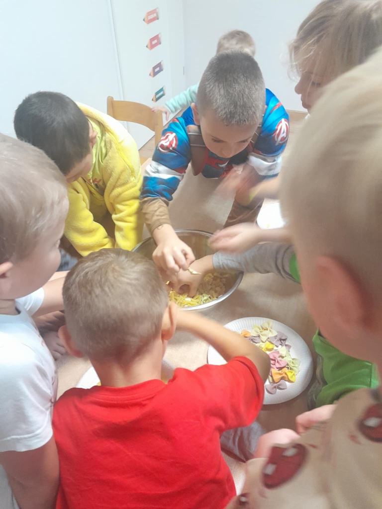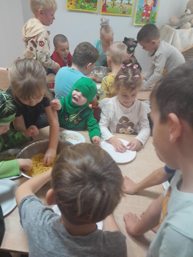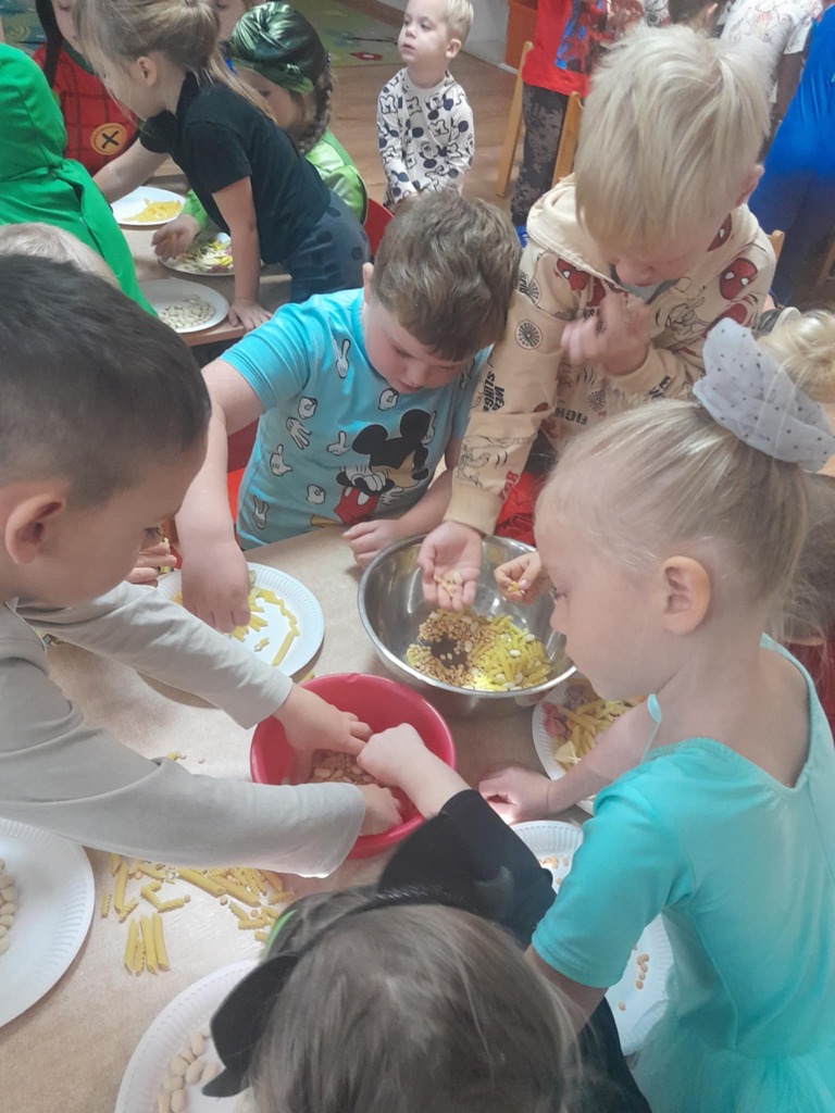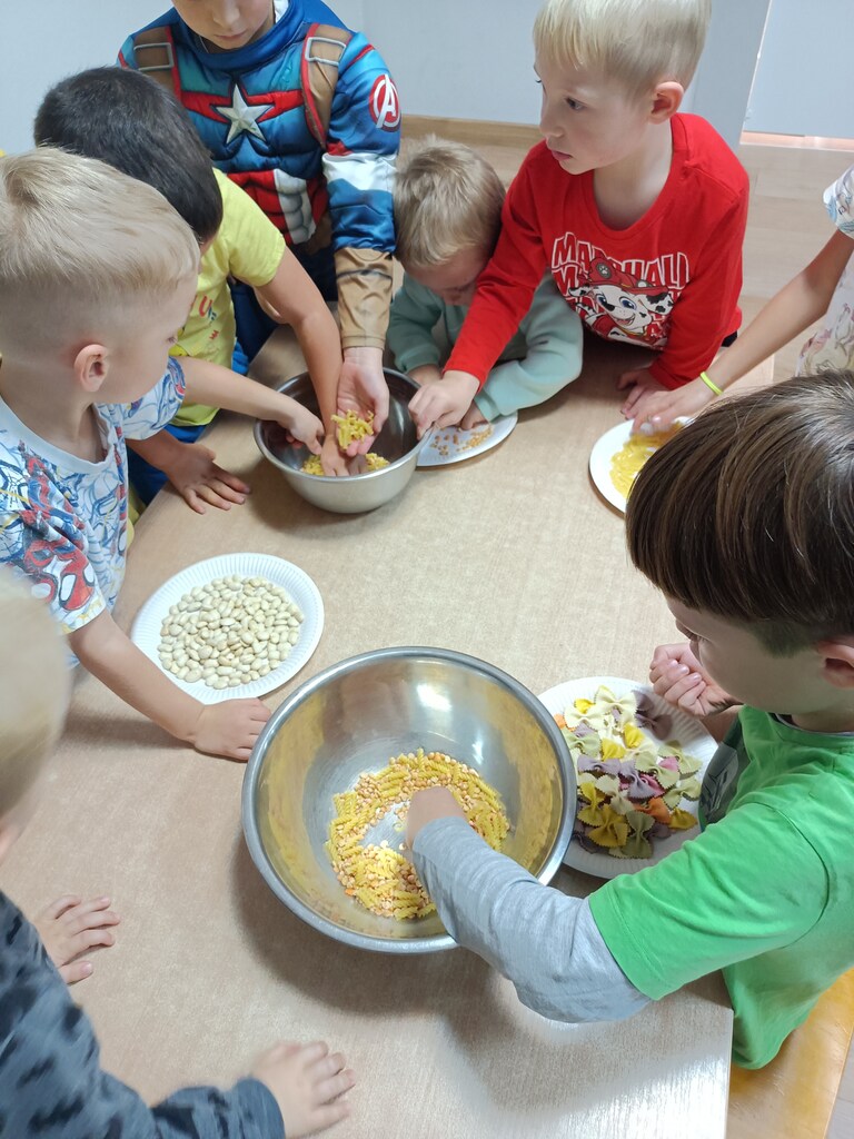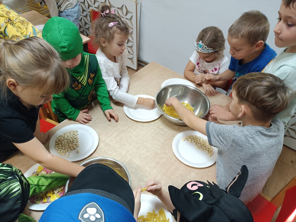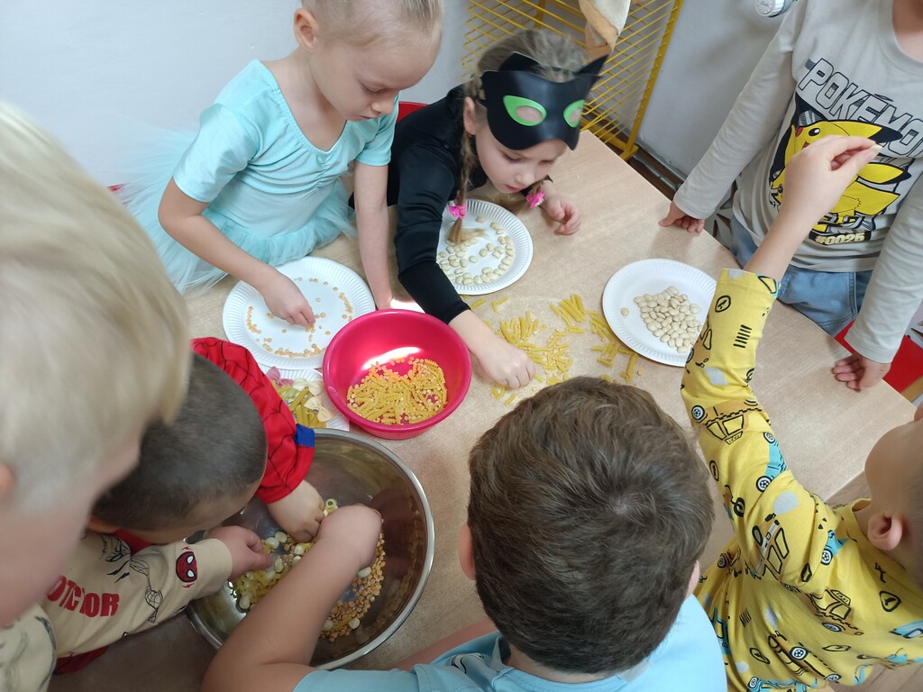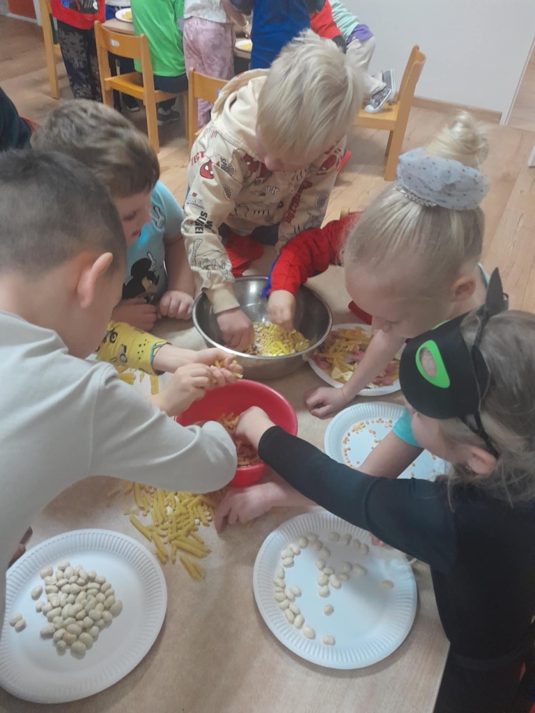 W dalszej części dnia dzieci uczestniczyły w zabawach muzyczno-ruchowych oraz wzięły udział w bajkowych stacjach zadaniowych. Jedną z nich była np. „Kopciuszek”, który musiał oddzielić i posegregować makaron, fasolę i groch – zadanie wymagało skupienia i cierpliwości! 🫘🍝