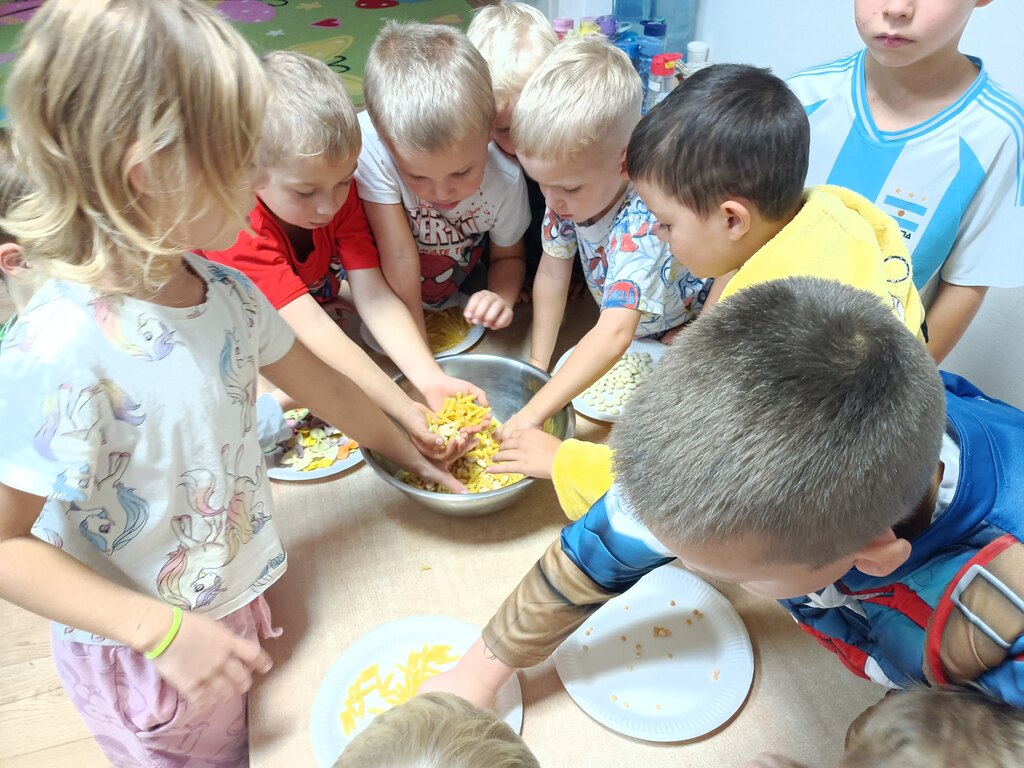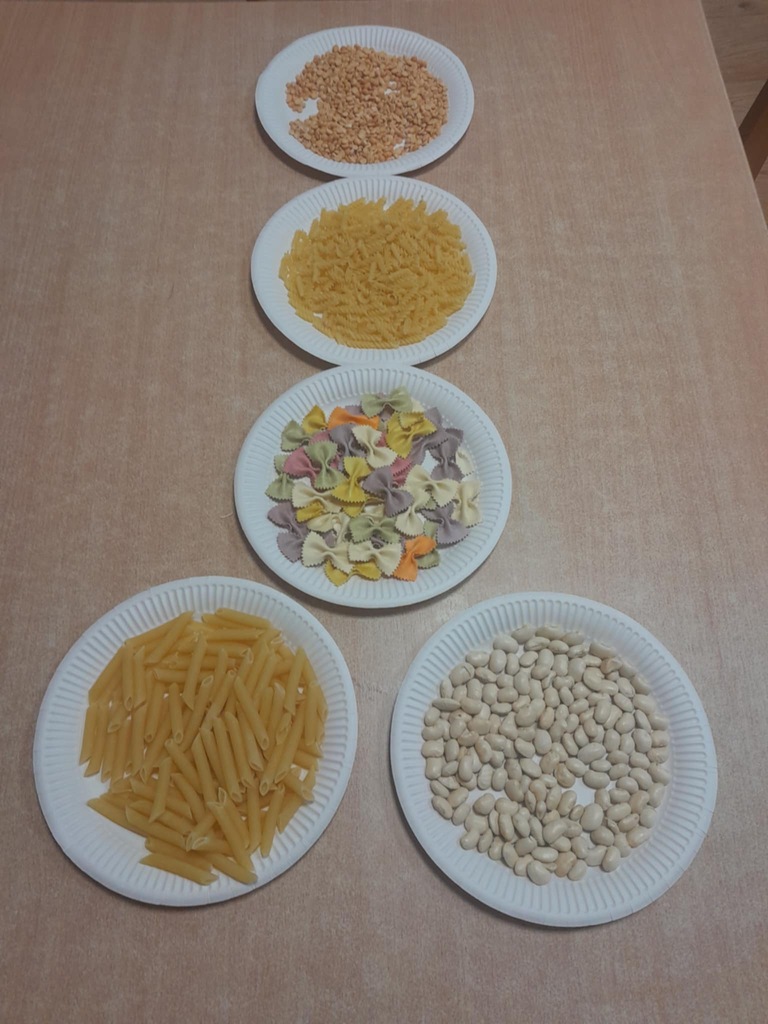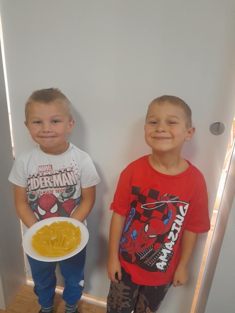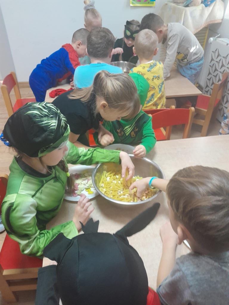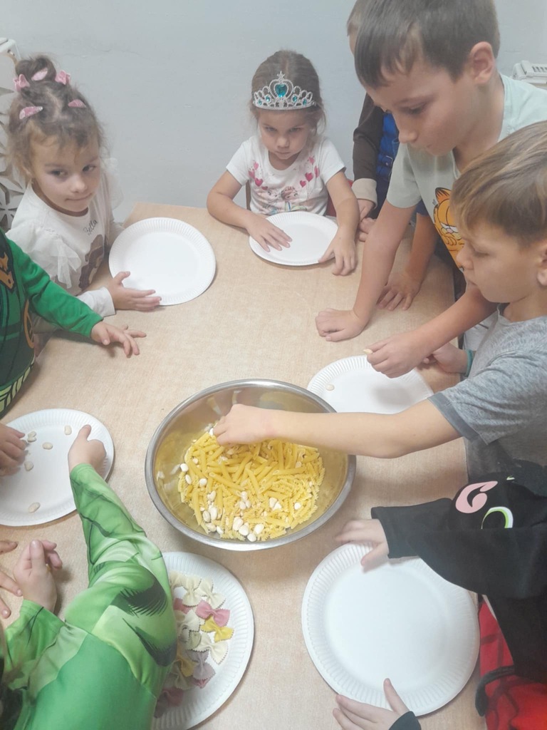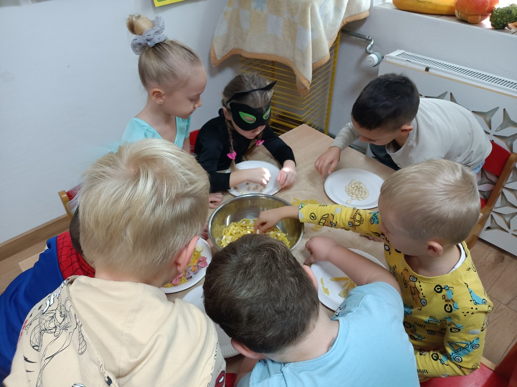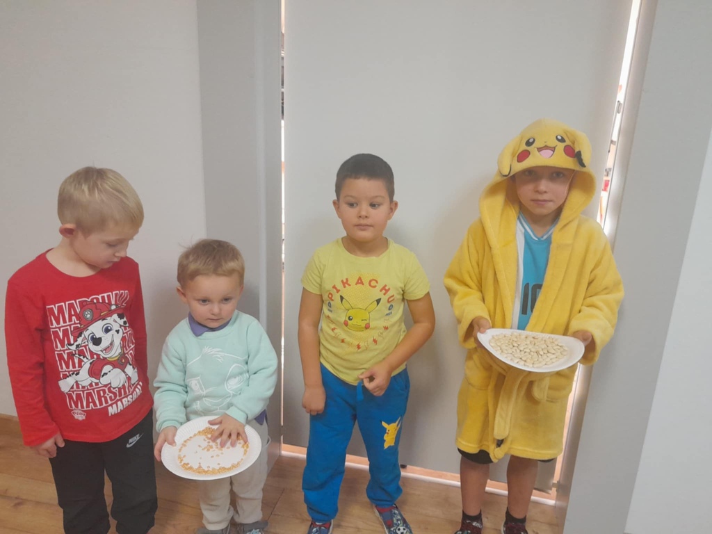 W dalszej części dnia dzieci uczestniczyły w zabawach muzyczno-ruchowych oraz wzięły udział w bajkowych stacjach zadaniowych. Jedną z nich była np. „Kopciuszek”, który musiał oddzielić i posegregować makaron, fasolę i groch – zadanie wymagało skupienia i cierpliwości! 🫘🍝