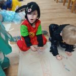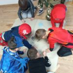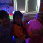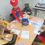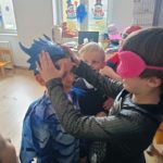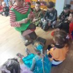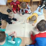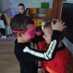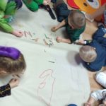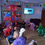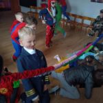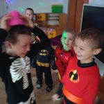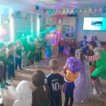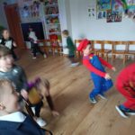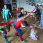 Dzieci bawiły się przy muzyce w dużym kole oraz w mniejszych grupach. Wspólnie śpiewały i tańczyły do znanych piosenek m.in „Krasnoludek” oraz „Kaczuszki”, które jak zawsze sprawiły wszystkim dużo radości. Dużym zainteresowaniem cieszyły się także zabawy z wędrującym kapeluszem i ukrytymi w nim zadaniami, przechodzenie pod liną oraz zabawa w odgadywanie imion kolegów i koleżanek z zasłoniętymi oczami. Nie zabrakło również zadań zespołowych z wykorzystaniem dużego arkusza szarego papieru, które sprzyjały współpracy i rozwijaniu kreatywności.