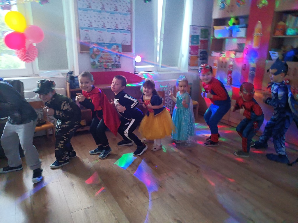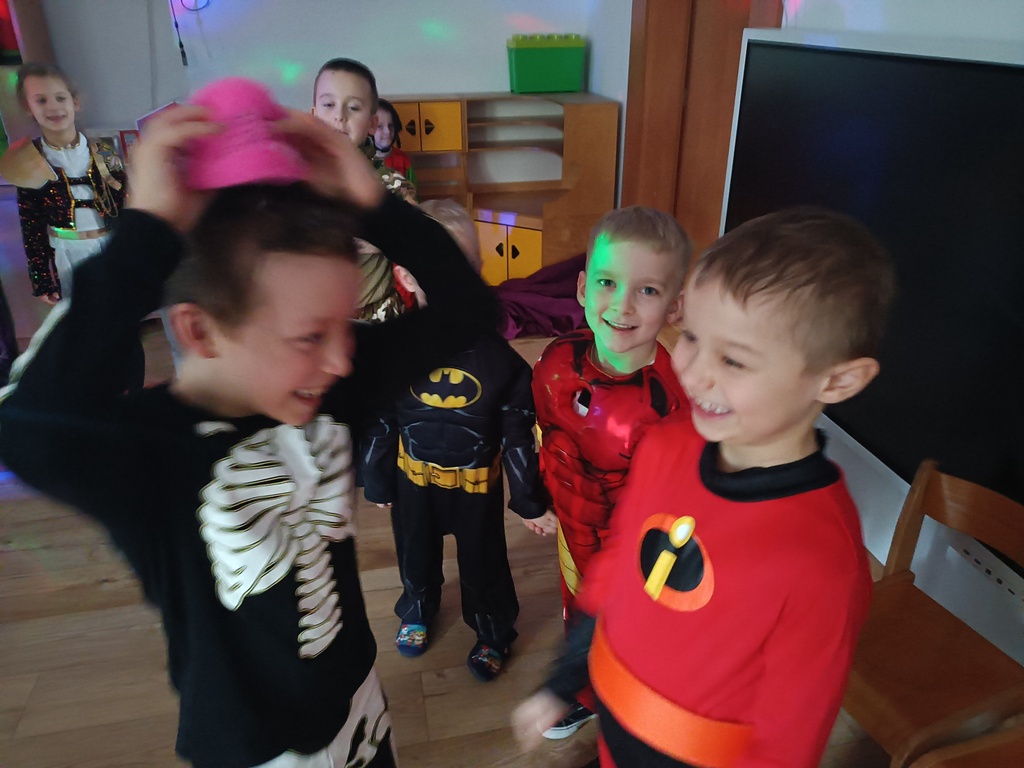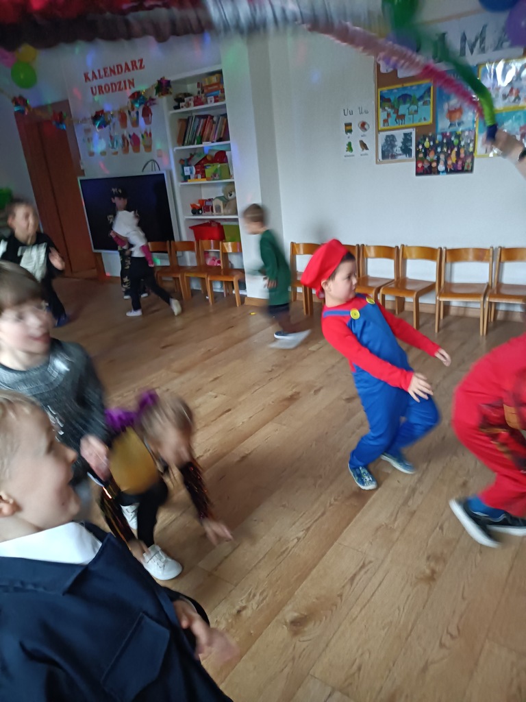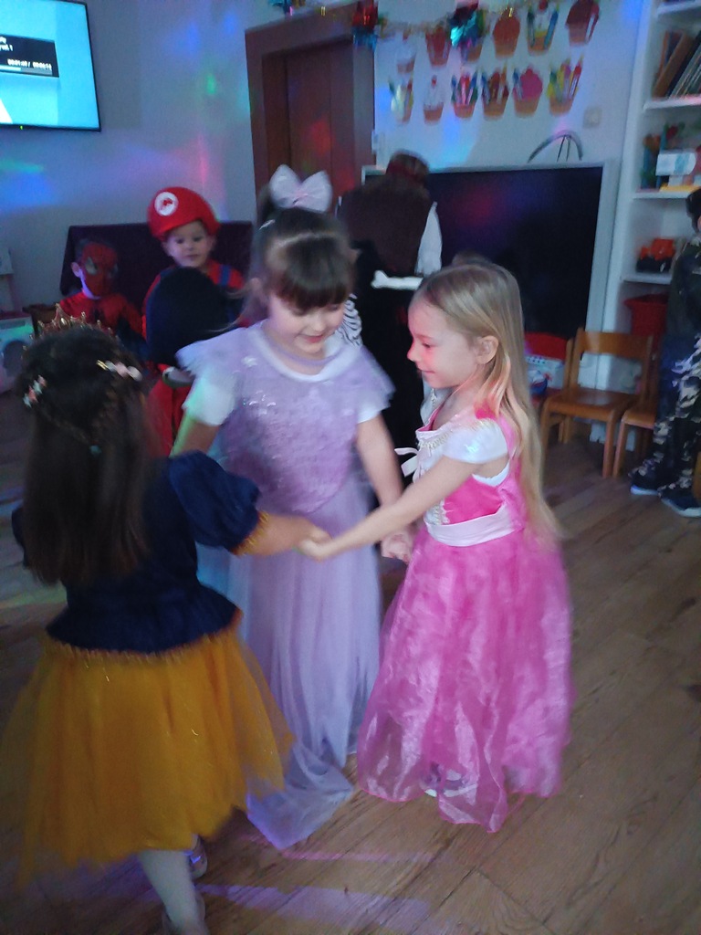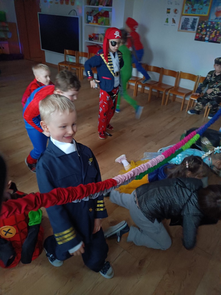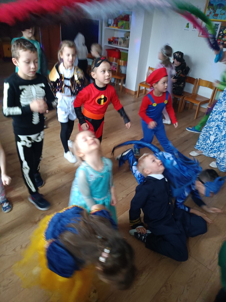 Dzieci bawiły się przy muzyce w dużym kole oraz w mniejszych grupach. Wspólnie śpiewały i tańczyły do znanych piosenek m.in „Krasnoludek” oraz „Kaczuszki”, które jak zawsze sprawiły wszystkim dużo radości. Dużym zainteresowaniem cieszyły się także zabawy z wędrującym kapeluszem i ukrytymi w nim zadaniami, przechodzenie pod liną oraz zabawa w odgadywanie imion kolegów i koleżanek z zasłoniętymi oczami. Nie zabrakło również zadań zespołowych z wykorzystaniem dużego arkusza szarego papieru, które sprzyjały współpracy i rozwijaniu kreatywności.