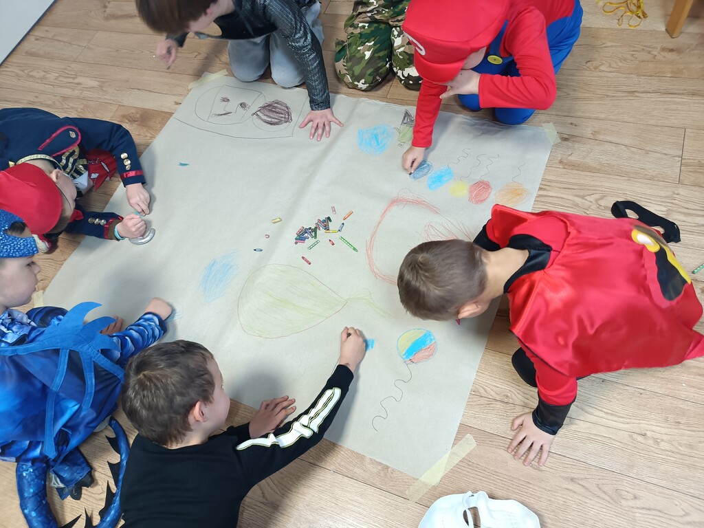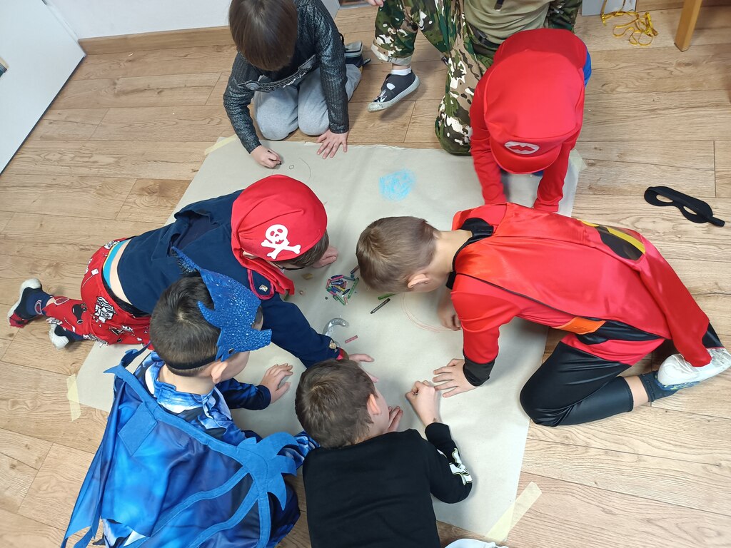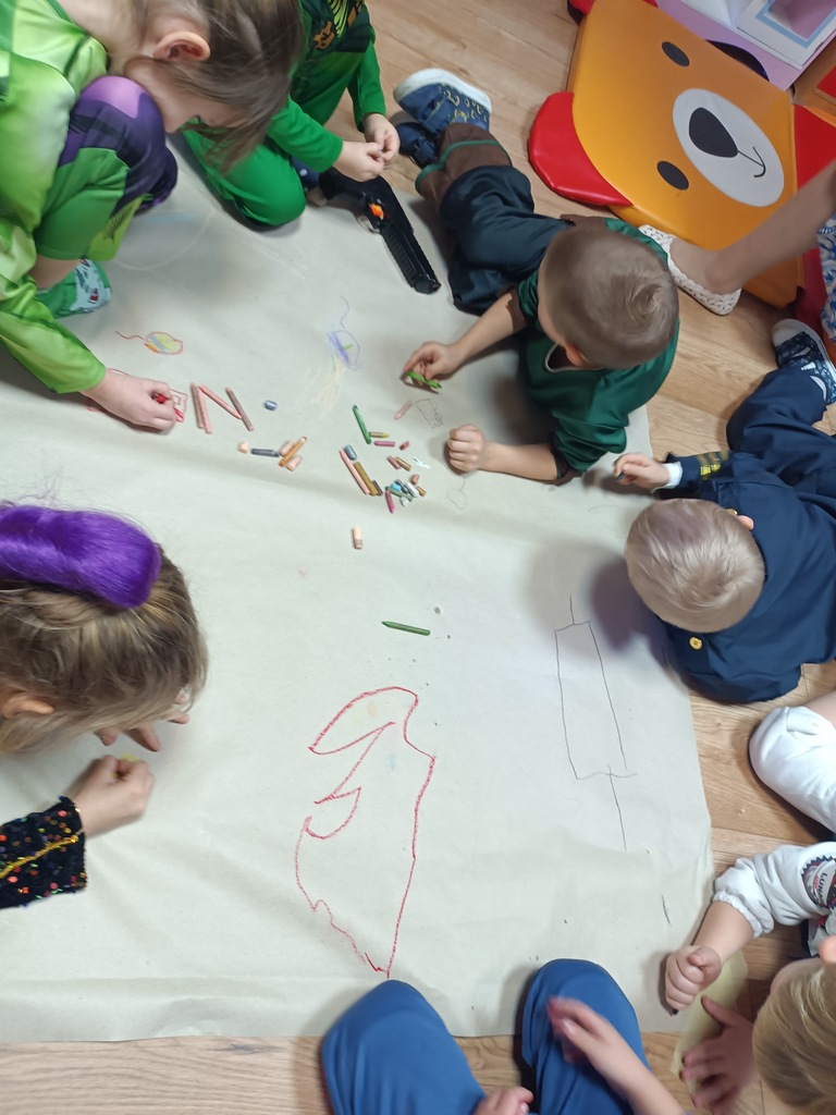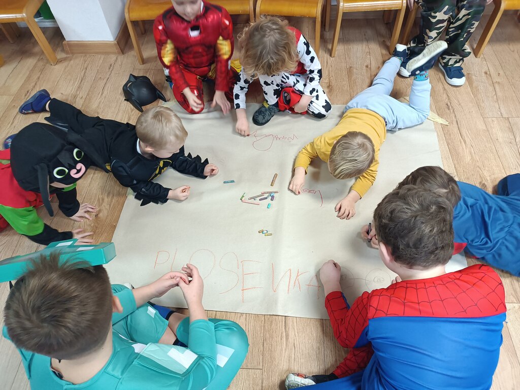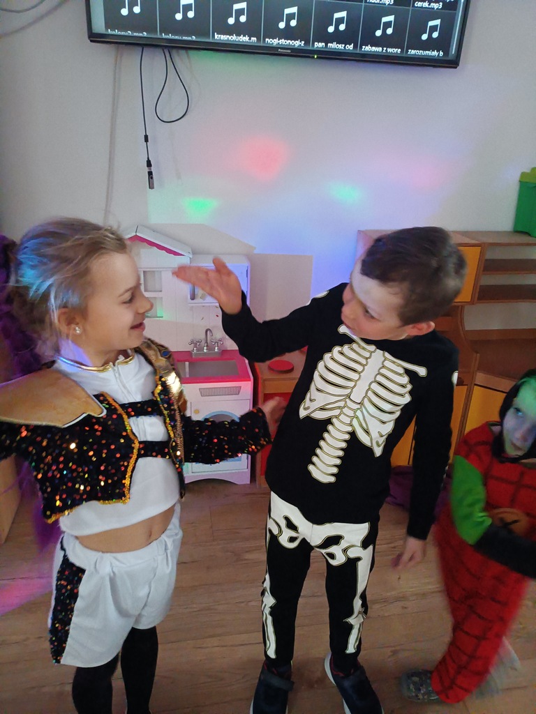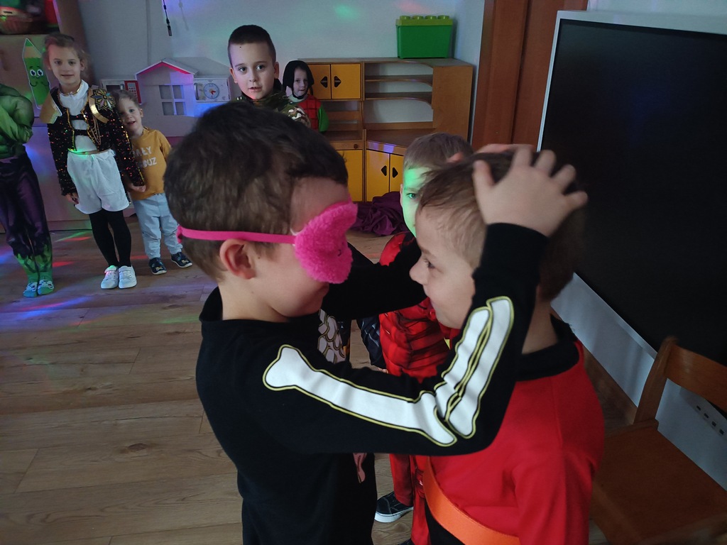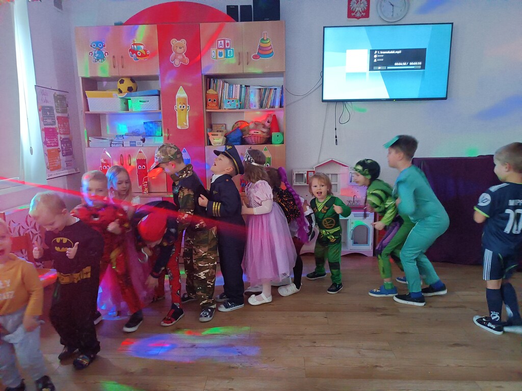 Dzieci bawiły się przy muzyce w dużym kole oraz w mniejszych grupach. Wspólnie śpiewały i tańczyły do znanych piosenek m.in „Krasnoludek” oraz „Kaczuszki”, które jak zawsze sprawiły wszystkim dużo radości. Dużym zainteresowaniem cieszyły się także zabawy z wędrującym kapeluszem i ukrytymi w nim zadaniami, przechodzenie pod liną oraz zabawa w odgadywanie imion kolegów i koleżanek z zasłoniętymi oczami. Nie zabrakło również zadań zespołowych z wykorzystaniem dużego arkusza szarego papieru, które sprzyjały współpracy i rozwijaniu kreatywności.