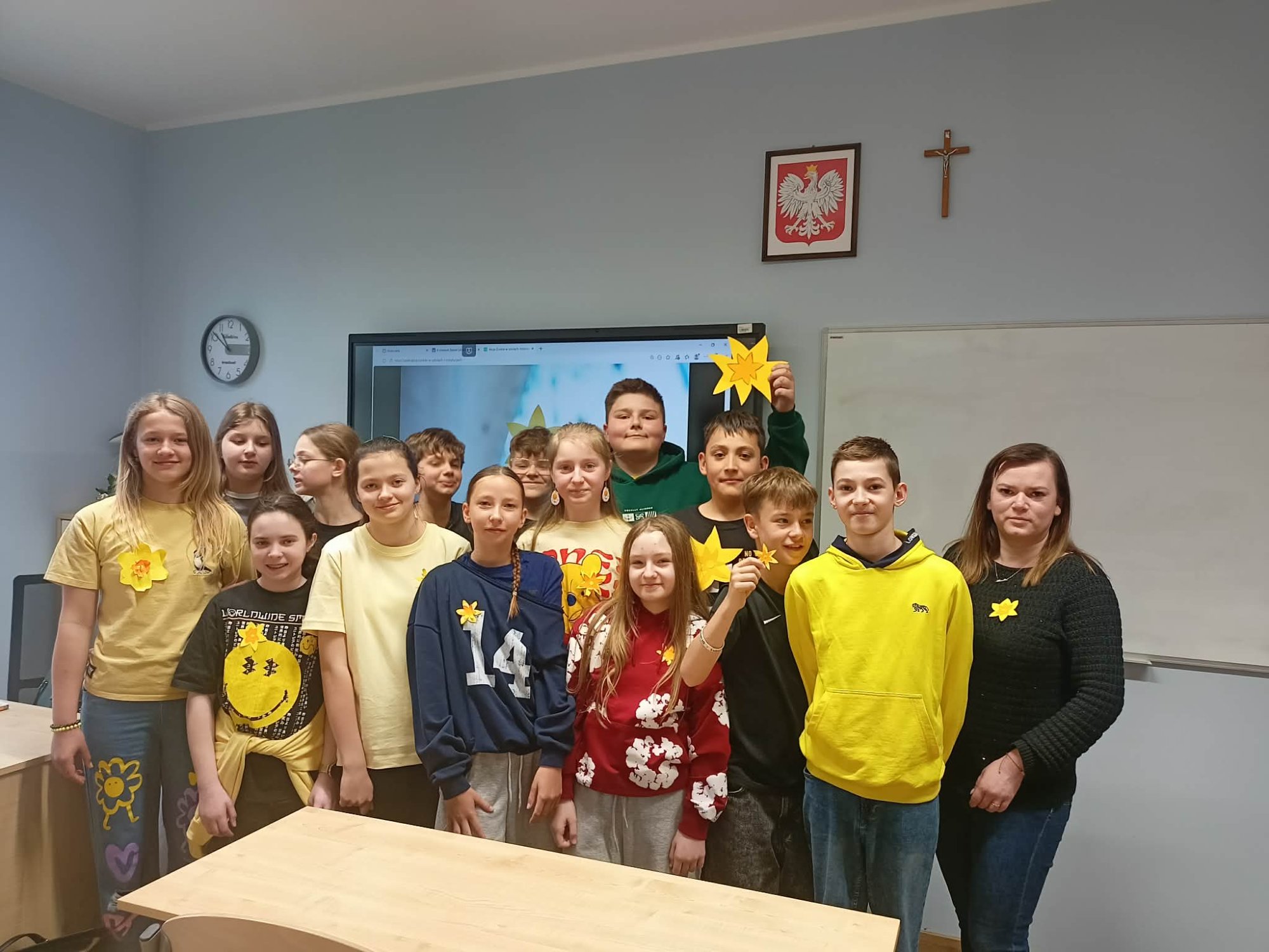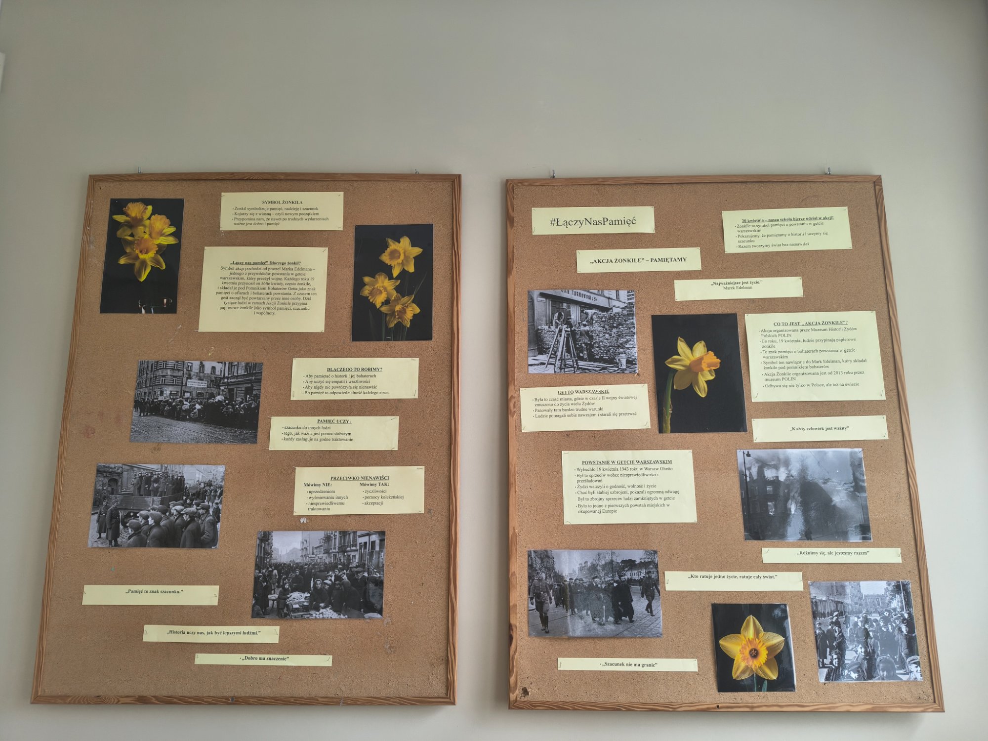 Na szkolnym korytarzu pojawiły się symboliczne bukiety z żonkili oraz gazetka tematyczna, która przybliżała ideę akcji i jej znaczenie. Całe wydarzenie było ważną lekcją wrażliwości, empatii i pamięci o przeszłości, a także okazją do wspólnego przeżywania wartości, które są fundamentem współczesnego społeczeństwa.