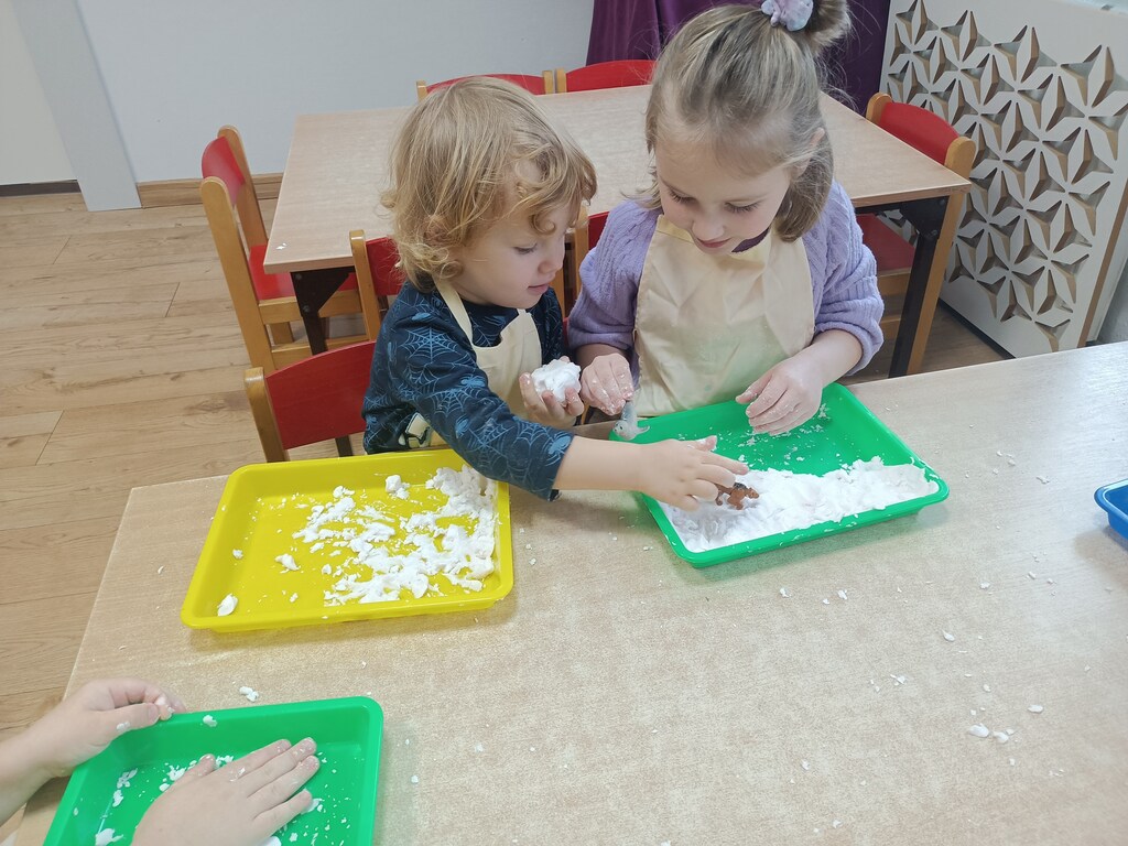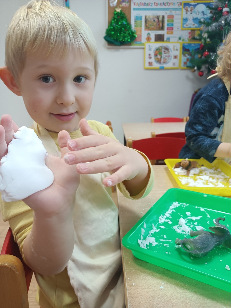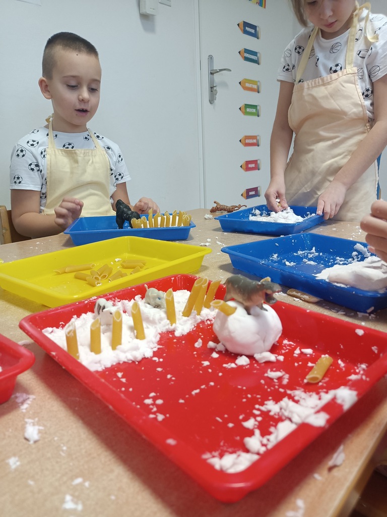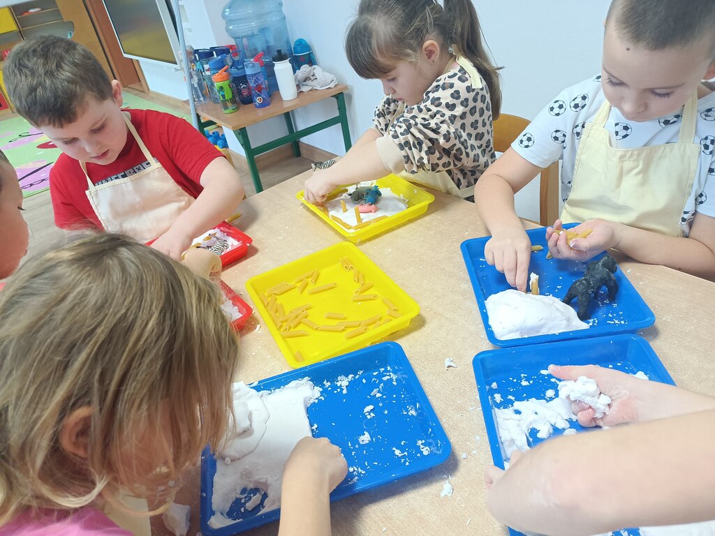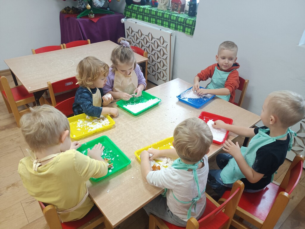 Podczas przerwy świątecznej w przedszkolu ćwiczyliśmy paluszki poprzez różnorodne aktywności. Dzieci uczestniczyły w zabawach paluszkowych, muzyczno-ruchowych, zabawach z brokatem oraz w stemplowaniu paluszkami. Największą frajdą okazała się jednak masa śniegowa i to, co udało się z niej stworzyć. Wyobraźnia poniosła nas daleko, a dzieci wykorzystywały do twórczych działań także makaron, tworząc niepowtarzalne kompozycje.