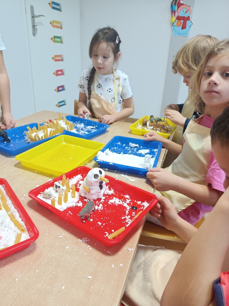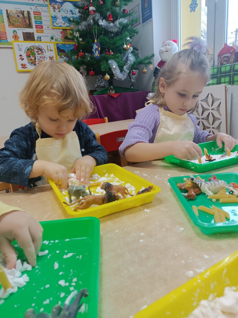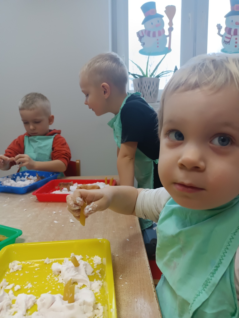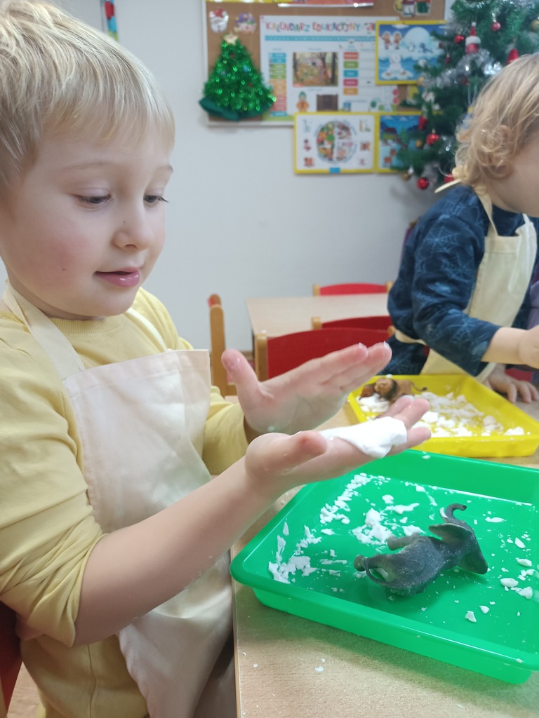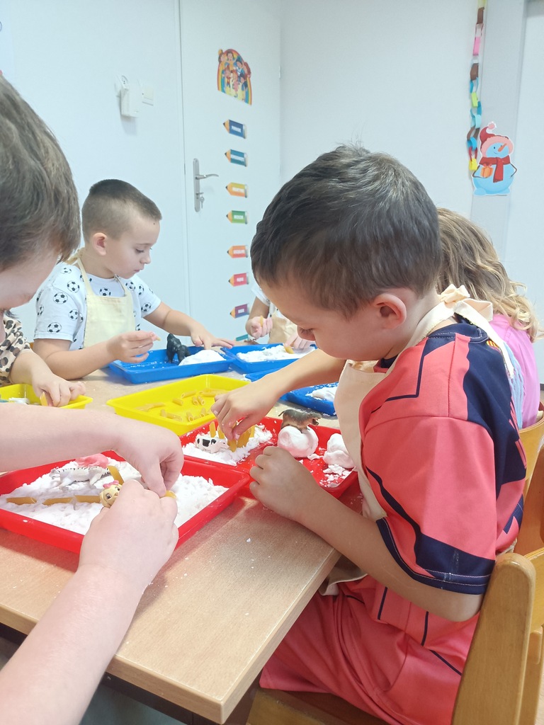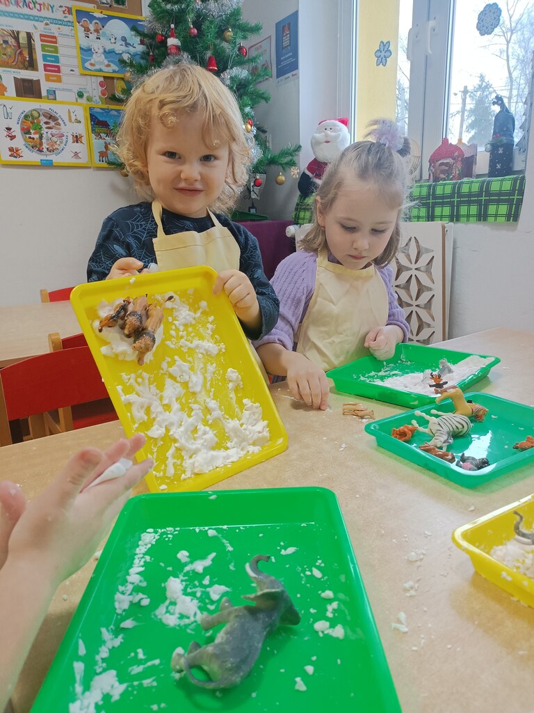 Podczas przerwy świątecznej w przedszkolu ćwiczyliśmy paluszki poprzez różnorodne aktywności. Dzieci uczestniczyły w zabawach paluszkowych, muzyczno-ruchowych, zabawach z brokatem oraz w stemplowaniu paluszkami. Największą frajdą okazała się jednak masa śniegowa i to, co udało się z niej stworzyć. Wyobraźnia poniosła nas daleko, a dzieci wykorzystywały do twórczych działań także makaron, tworząc niepowtarzalne kompozycje.