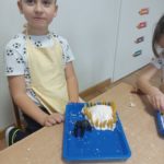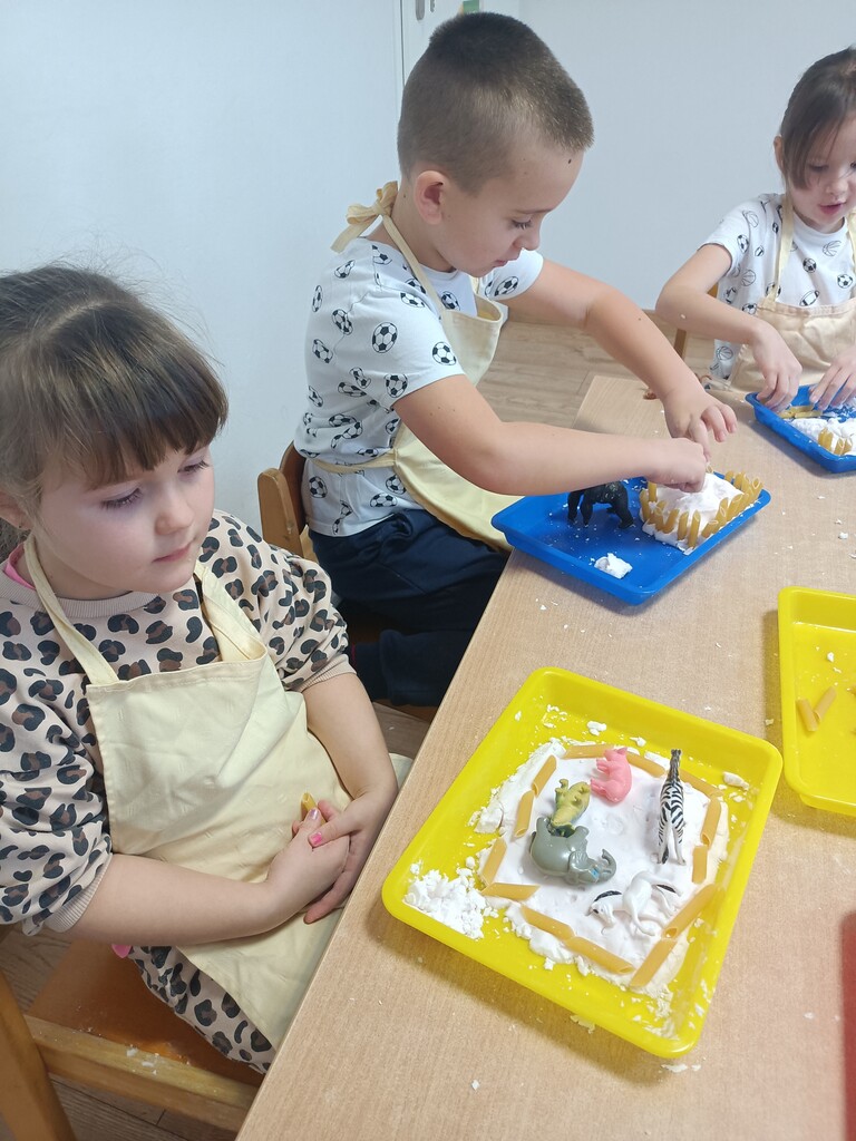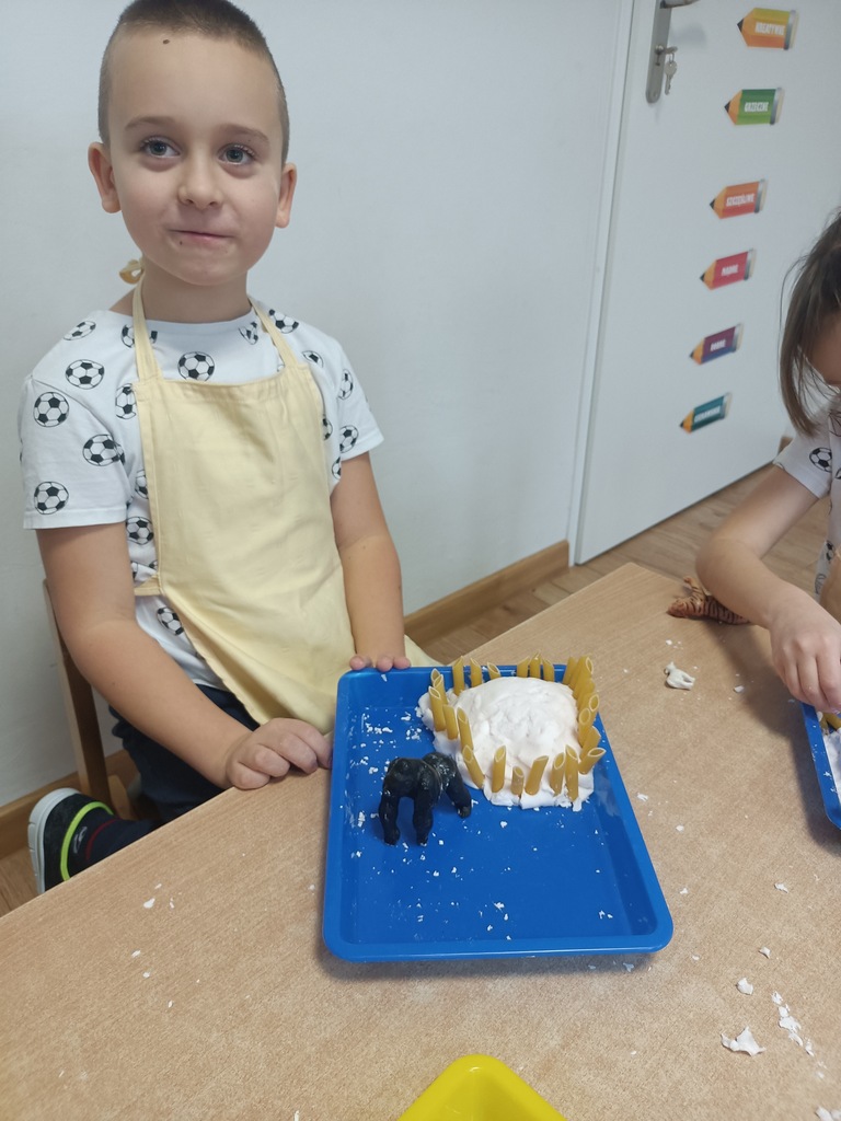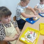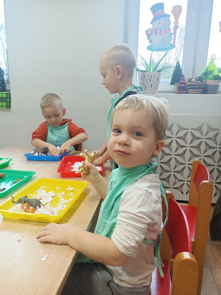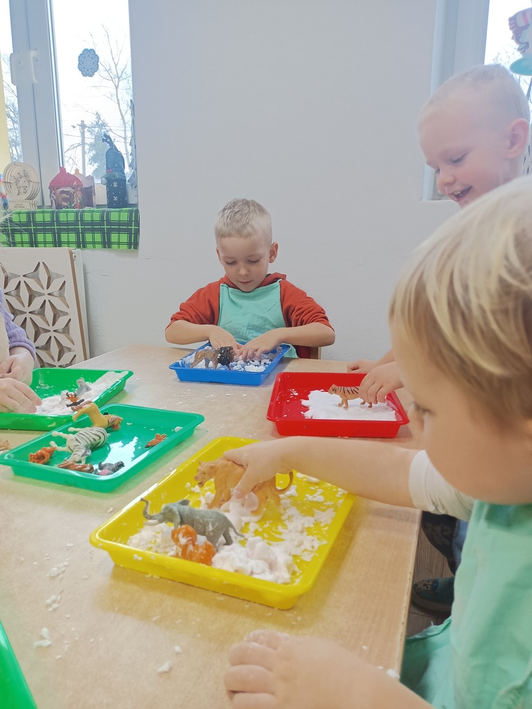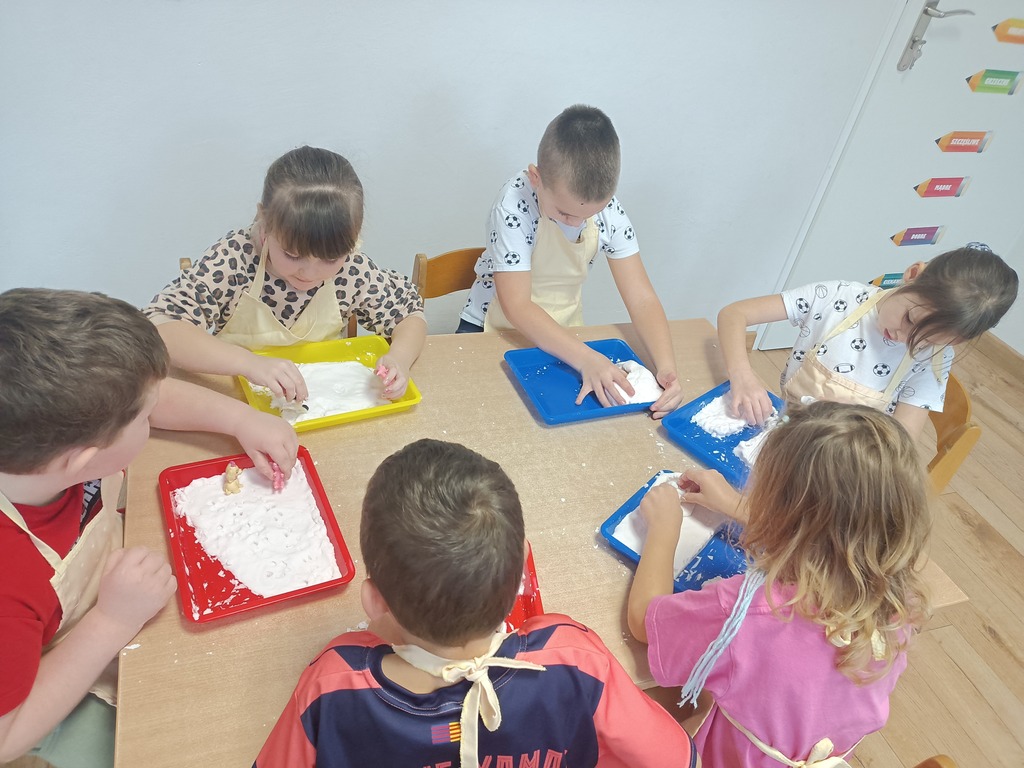 Podczas przerwy świątecznej w przedszkolu ćwiczyliśmy paluszki poprzez różnorodne aktywności. Dzieci uczestniczyły w zabawach paluszkowych, muzyczno-ruchowych, zabawach z brokatem oraz w stemplowaniu paluszkami. Największą frajdą okazała się jednak masa śniegowa i to, co udało się z niej stworzyć. Wyobraźnia poniosła nas daleko, a dzieci wykorzystywały do twórczych działań także makaron, tworząc niepowtarzalne kompozycje.
