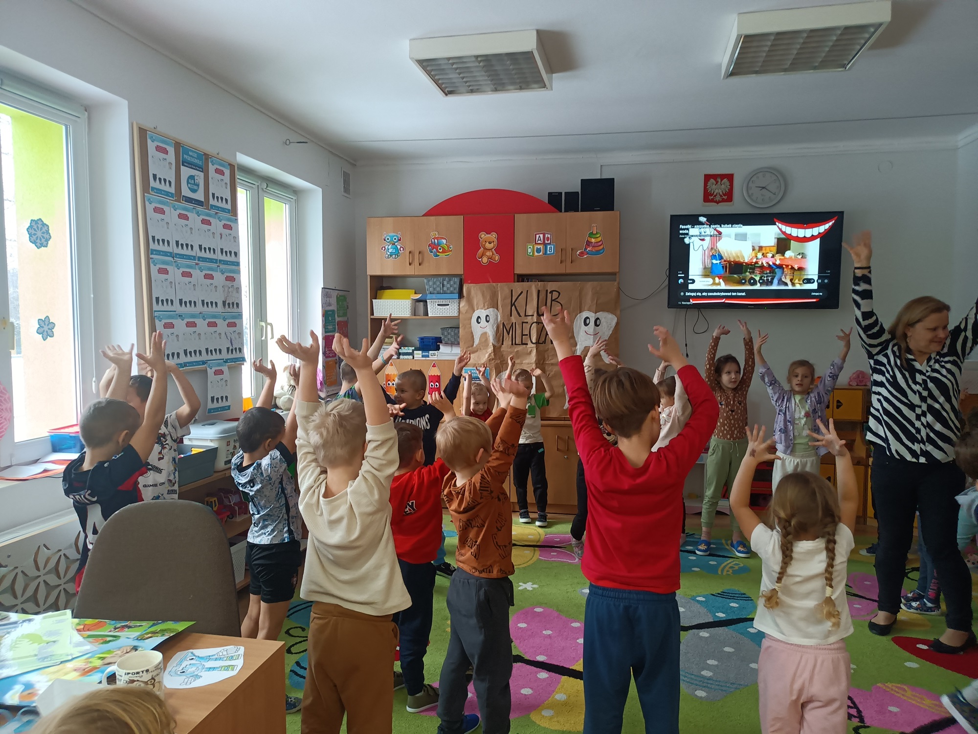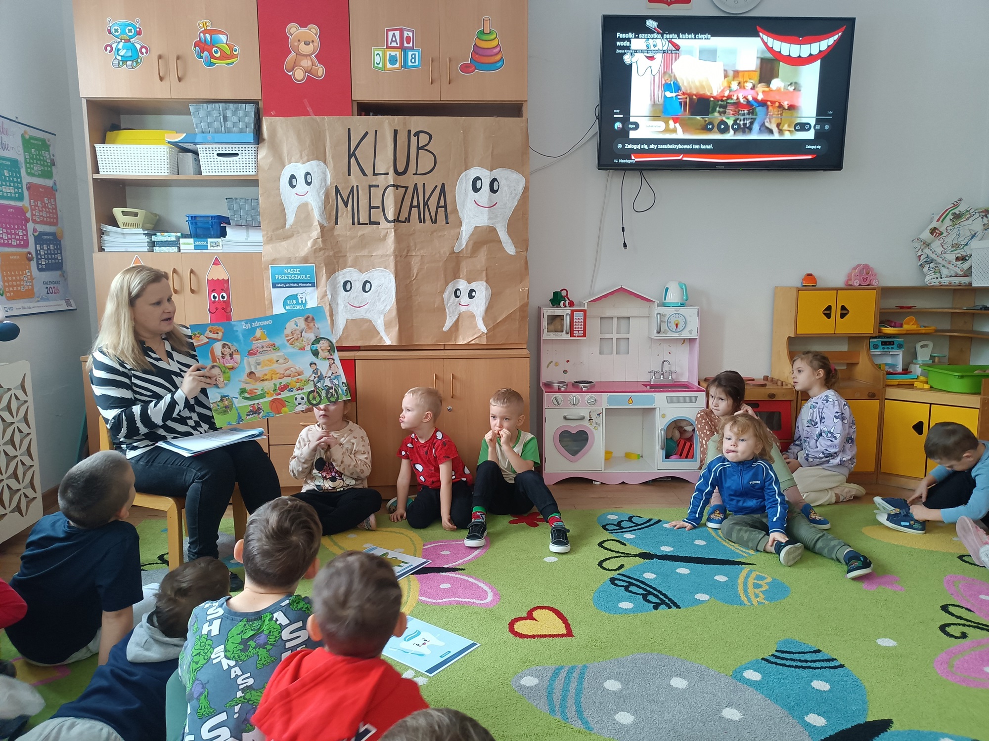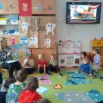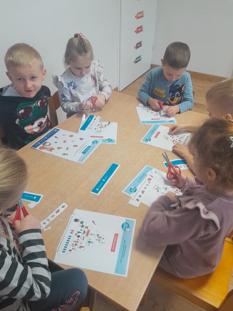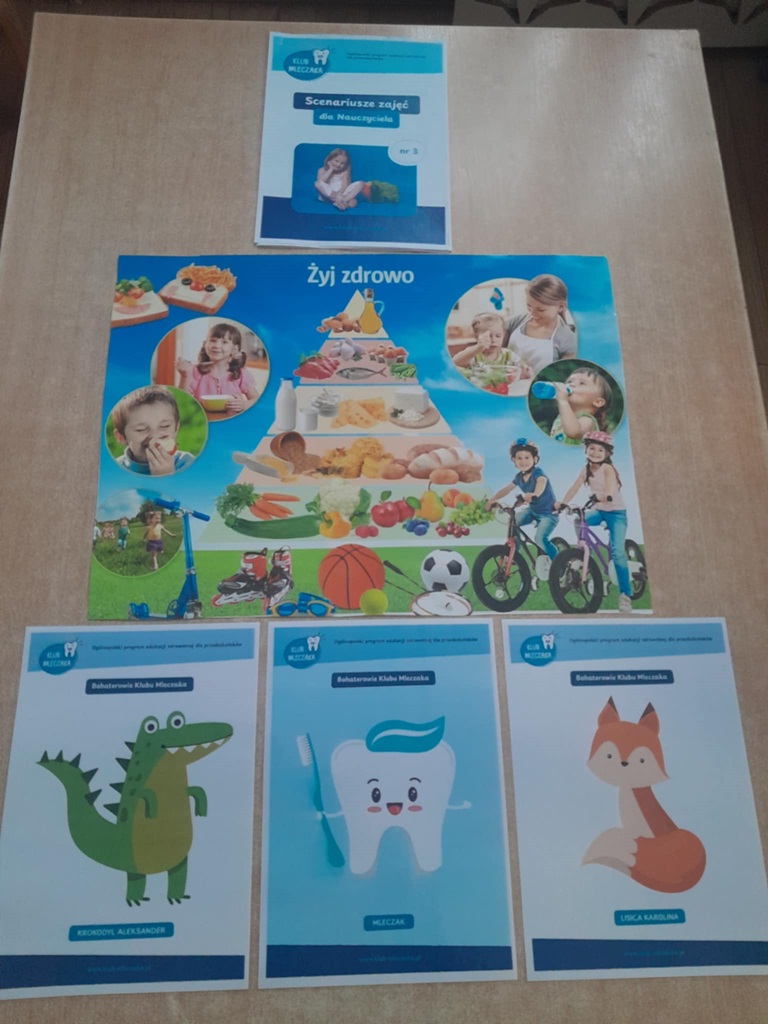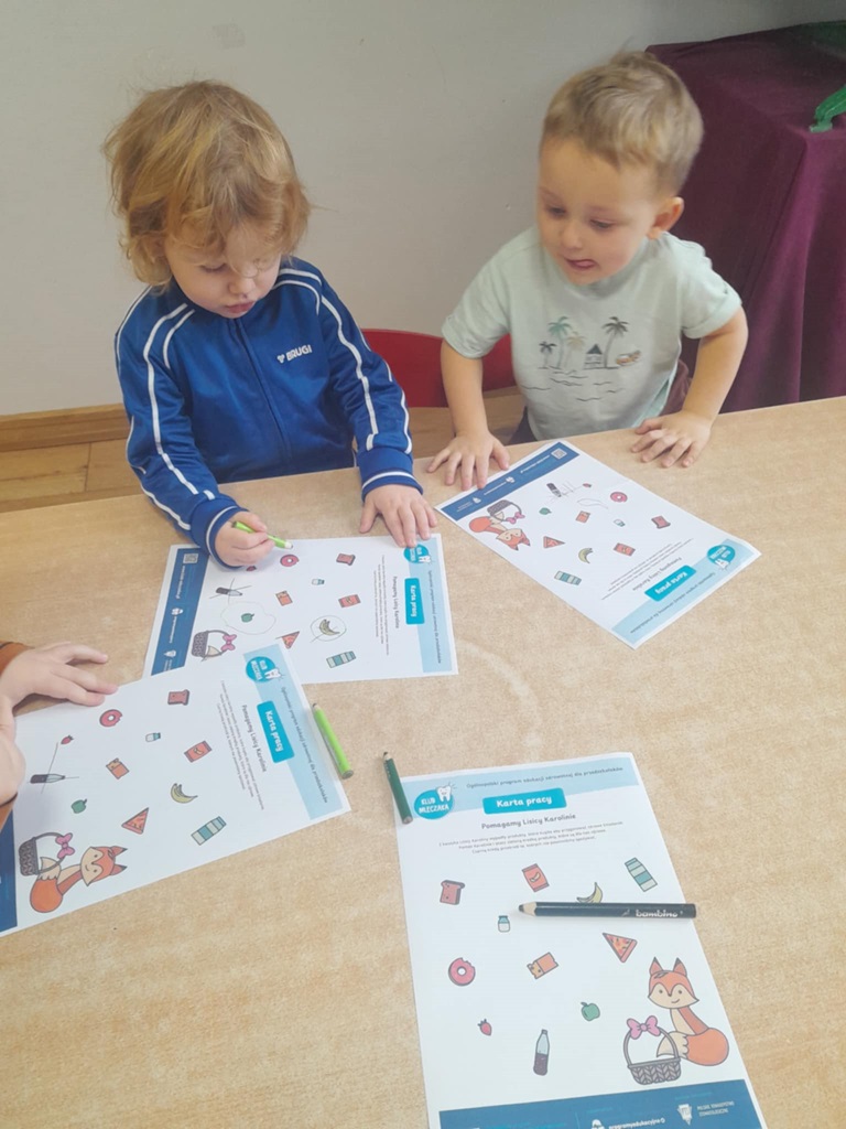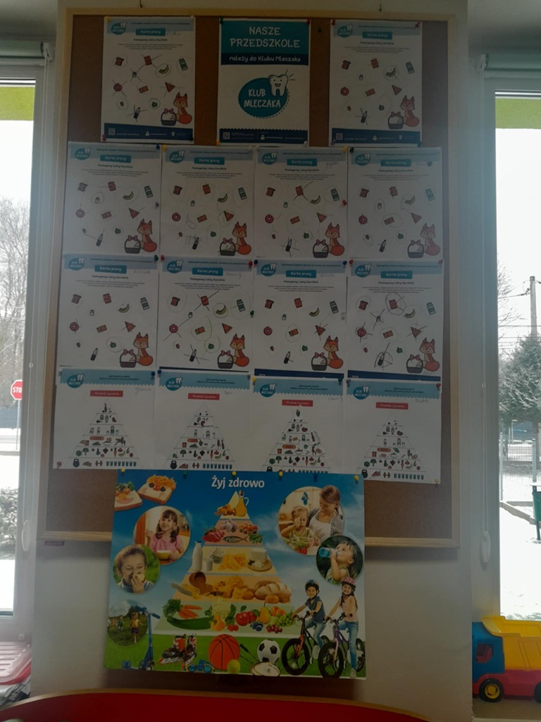 W czwartek 7 stycznia 2026 nasze przedszkolaki zrealizowały kolejny scenariusz programu edukacyjnego Klubu Mleczaka pt:” Zdrowo jemy z Liscicą Karoliną”. Dzieci wysłuchały opowiadania o przygodach Lisicy, która stosuje zasady piramidy żywienia🥦🍎. Dlatego też przypomnieliśmy poszczególne szczeble piramidy, podkreślając co warto jeść, a czego unikać, aby być zdrowym i mieć piękne ząbki. Przedszkolaki dowiedziały się jak ważna w naszym życiu jest aktywność fizyczna. Wspólnie wykonaliśmy ćwiczenia gimnastyczne 🤸 i zaśpiewaliśmy znaną piosenkę ” Myję zęby”🎶🪥. Na koniec przedszkolaki wykonały kartę pracy – piramidę żywienia.