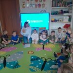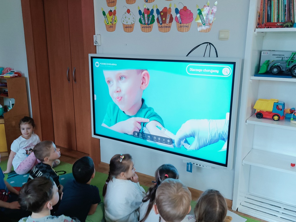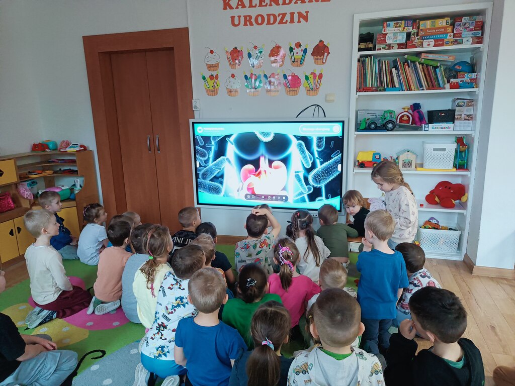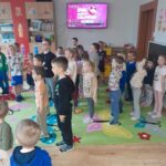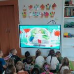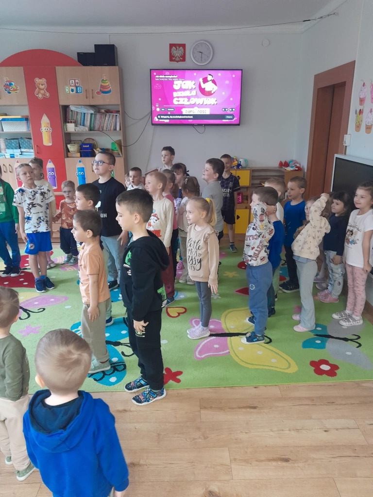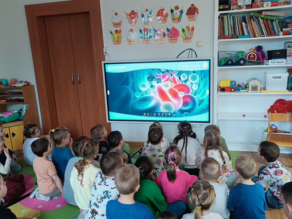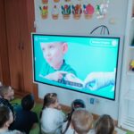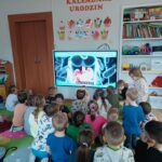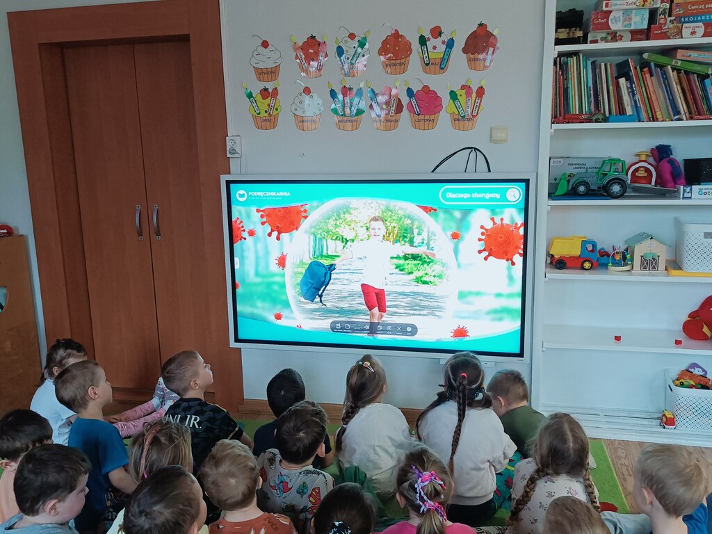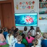 Następnie przedszkolaki obejrzały film edukacyjny „Dlaczego chorujemy?” z serii „Kuferek pełen wiedzy”. Dzięki niemu dowiedziały się, czym są zarazki i jak możemy chronić się przed chorobami. Ważnym elementem dnia były również zabawy ruchowe, w tym „Zarazki – szczepionka”, które w atrakcyjny sposób utrwaliły zdobytą wiedzę.