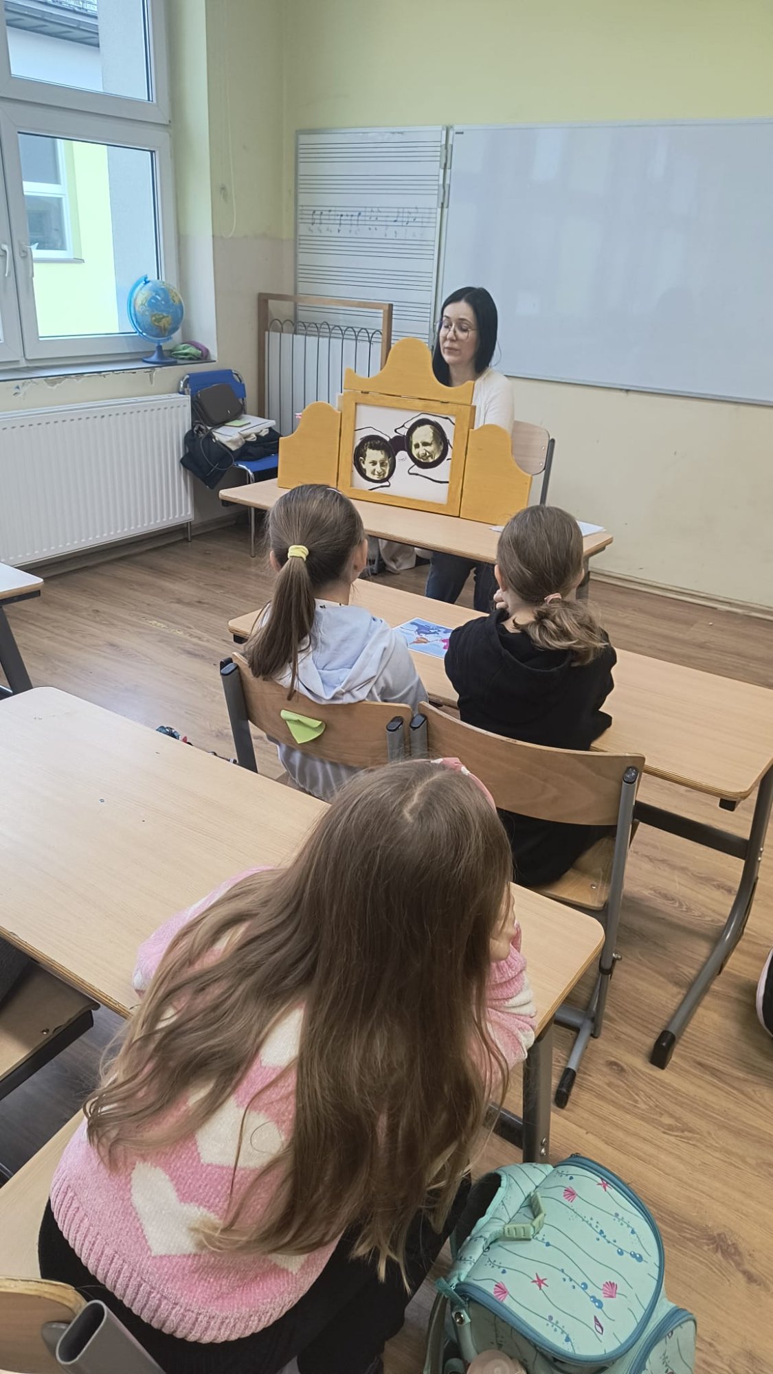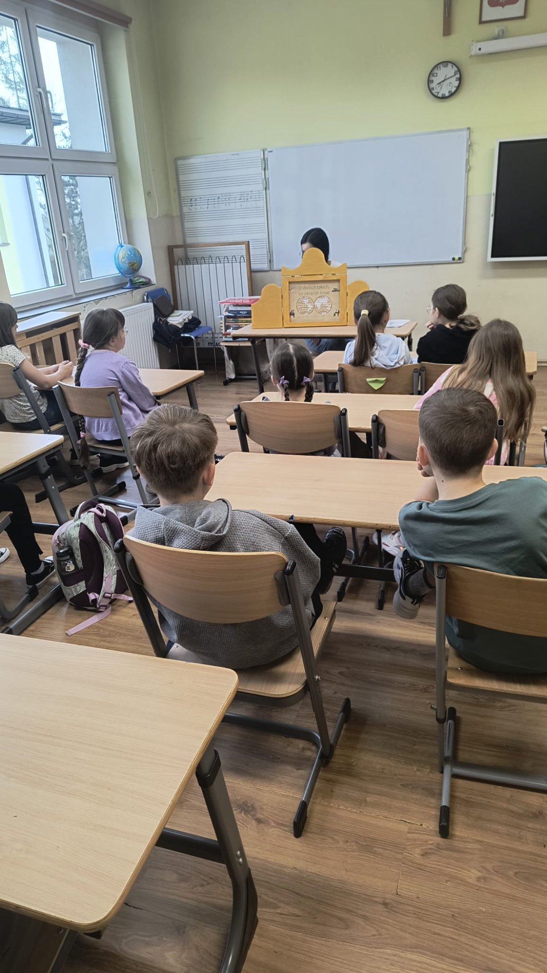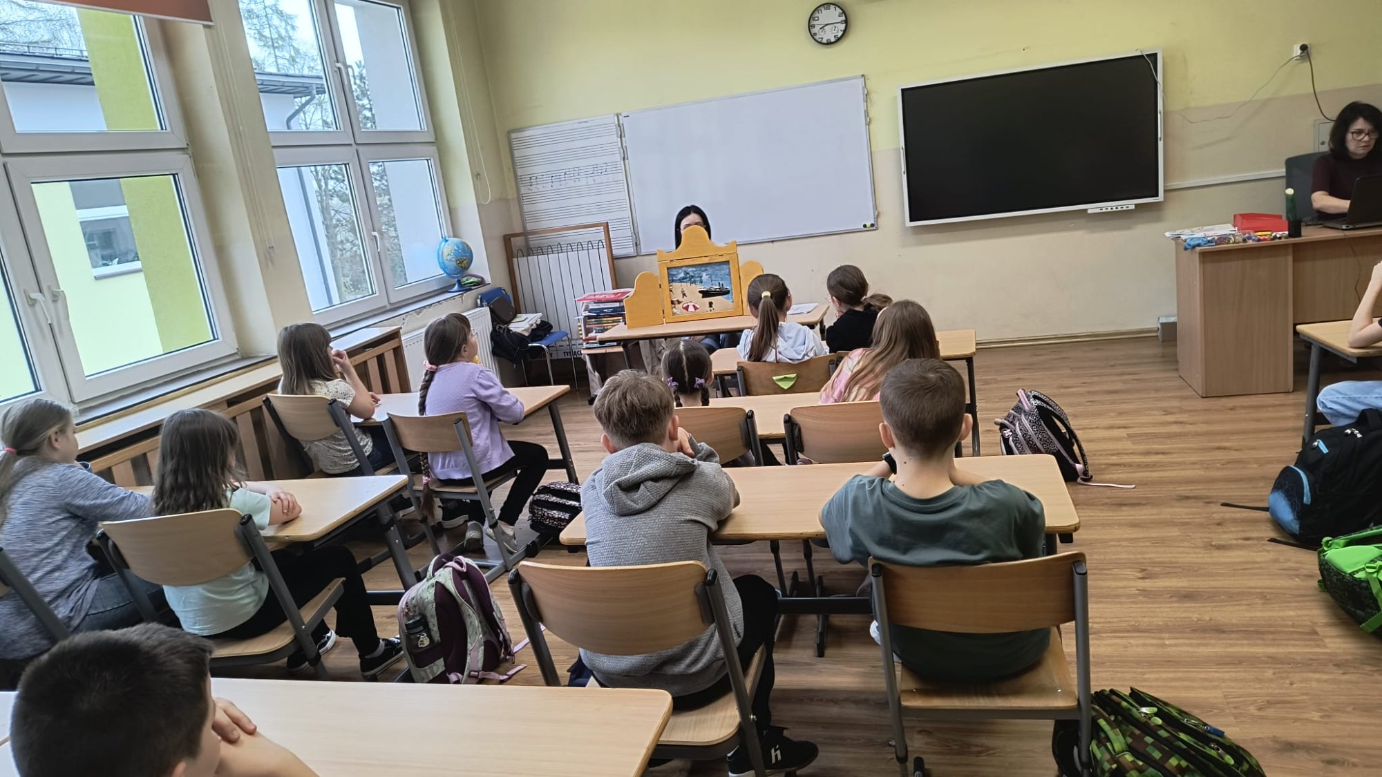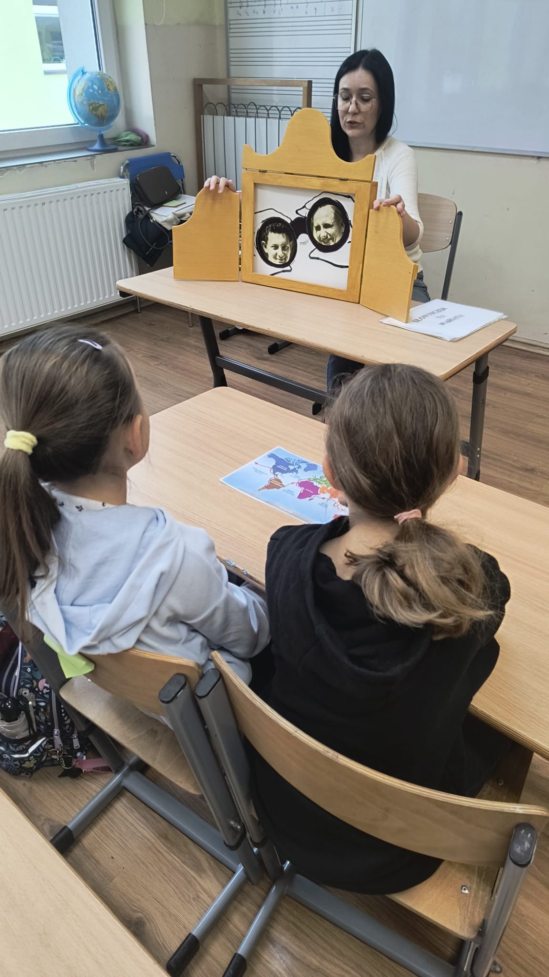 Pani bibliotekarka w magiczny sposób opowiedziała o ich wyprawie, korzystając z japońskiego teatrzyku obrazkowego Kamishibai. Dowiedzieliśmy się, jak podróżnicy wyruszyli w trasę z zapasem jabłek i ogórków kiszonych oraz jakie przygody spotkały ich po drodze. Oglądaliśmy również autentyczne zdjęcia z wypraw Leona i Tadeusza, co rozpaliło naszą wyobraźnię!