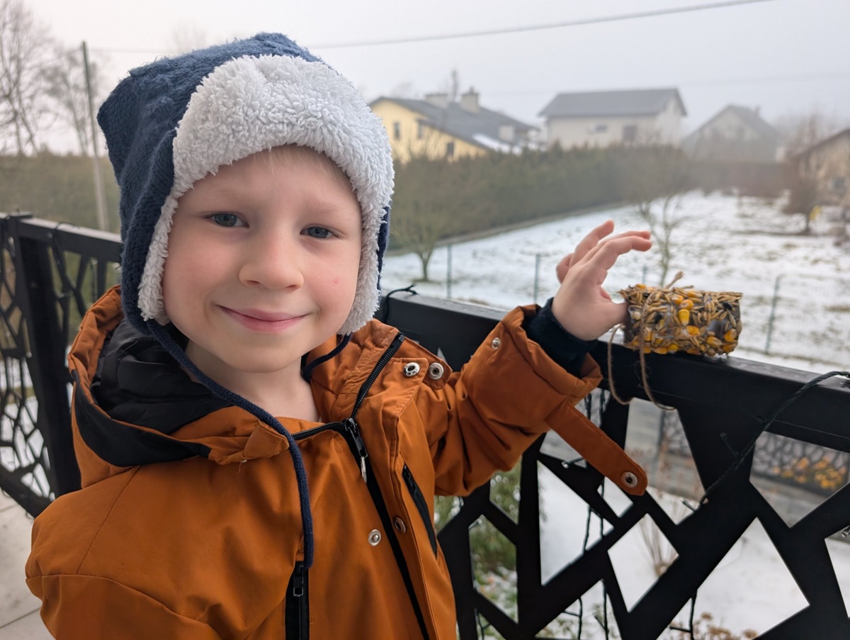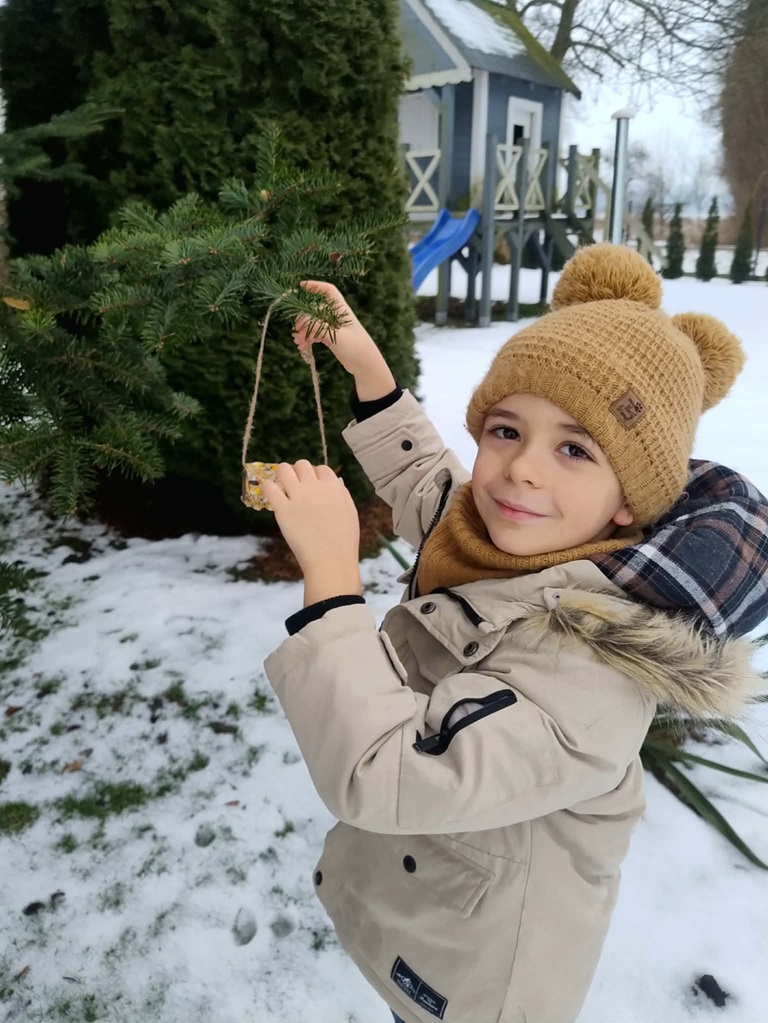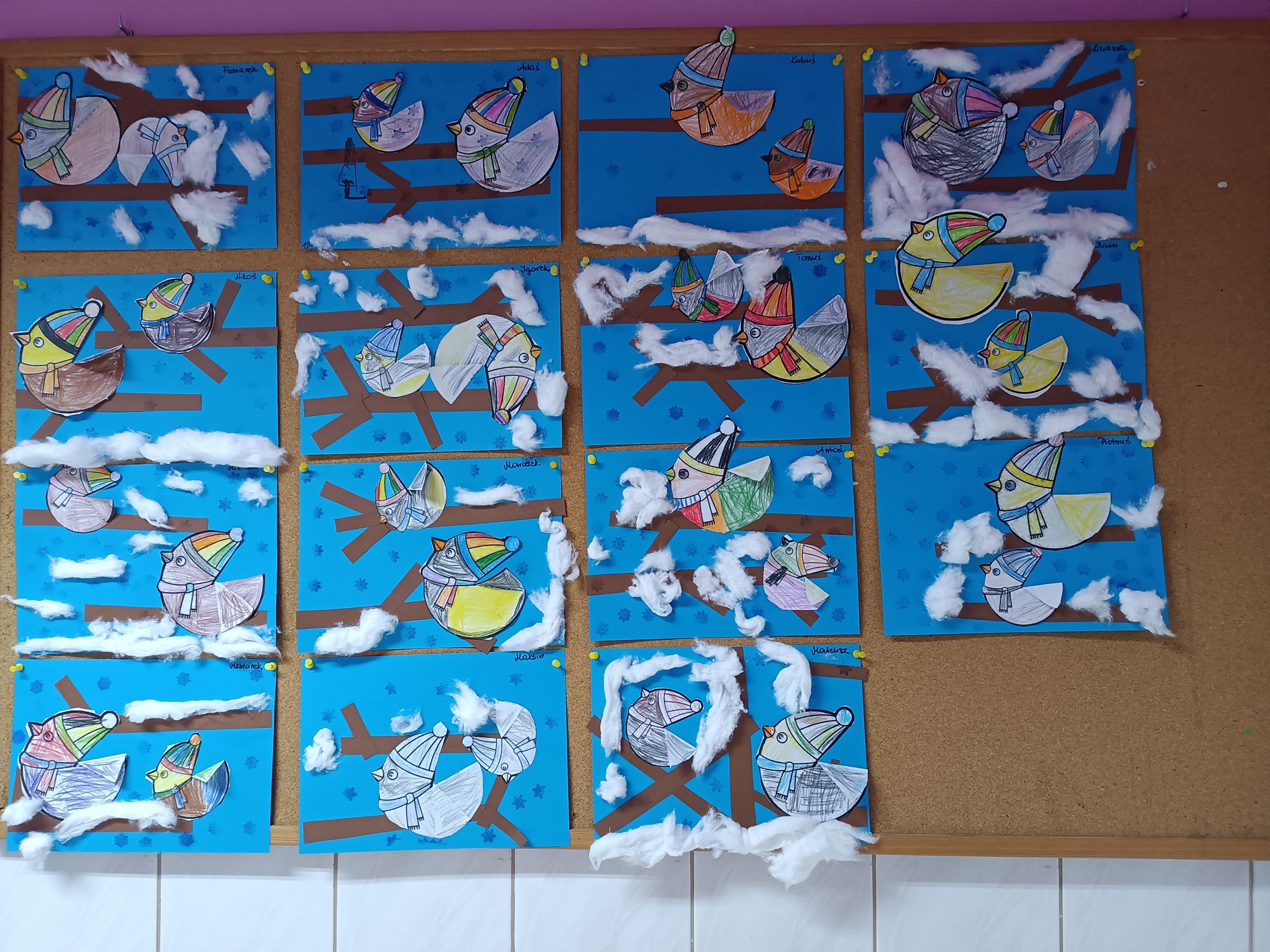 W czwartek starszaki wykonały ptasią stołówkę – smarowały rolkę papierową smalcem i obtaczały w ziarenkach. Zabrały karmniki do domu, aby obserwować skrzydlatych przyjaciół – każdy powiesił swój ekologiczny karmnik w wybranym miejscu, aby przez weekend cieszyć się widokiem ptaków:) Przed wykonaniem stołówki dzieci słuchały ciekawostek o dokarmianiu ptaków i rozmawiały o swoich doświadczeniach w pomaganiu ptaszkom. W piątek przyszedł czas na pracę plastyczną „Ptaszki w zimowym krajobrazie”. Kolorowaliśmy, wycinaliśmy, kleiliśmy i starannie rozplanowywaliśmy obrazek na kartce. To była nie tylko ciekawa i kreatywna praca, ale przede wszystkim pozwoliła nam rozwijać sprawność manualną.