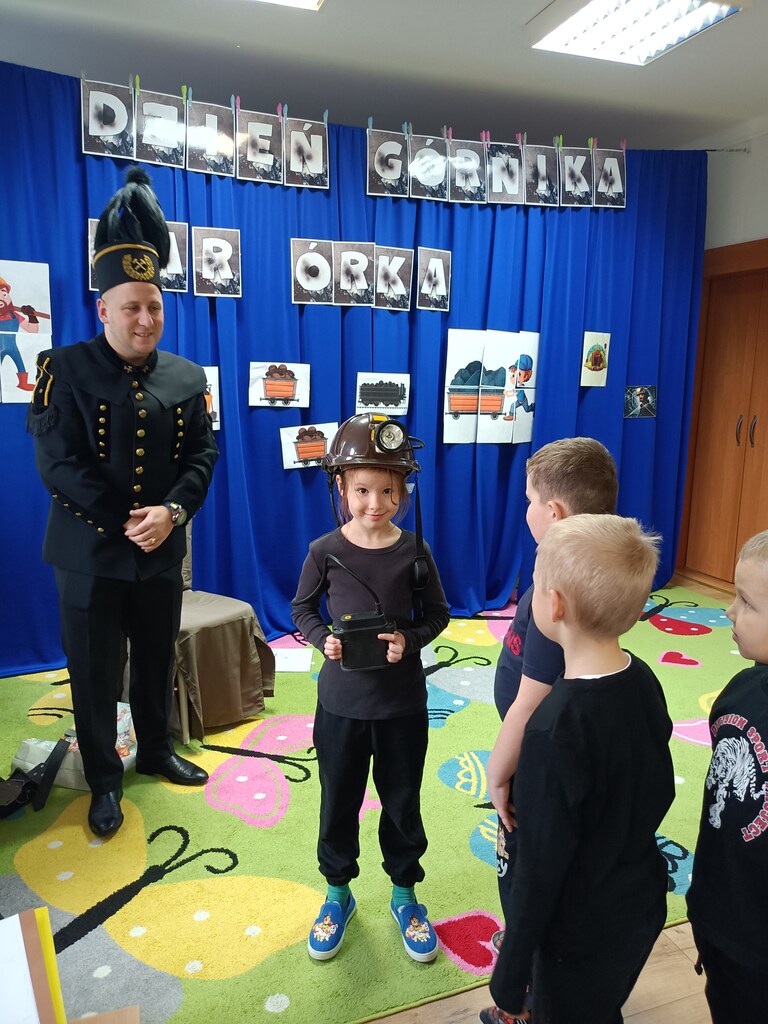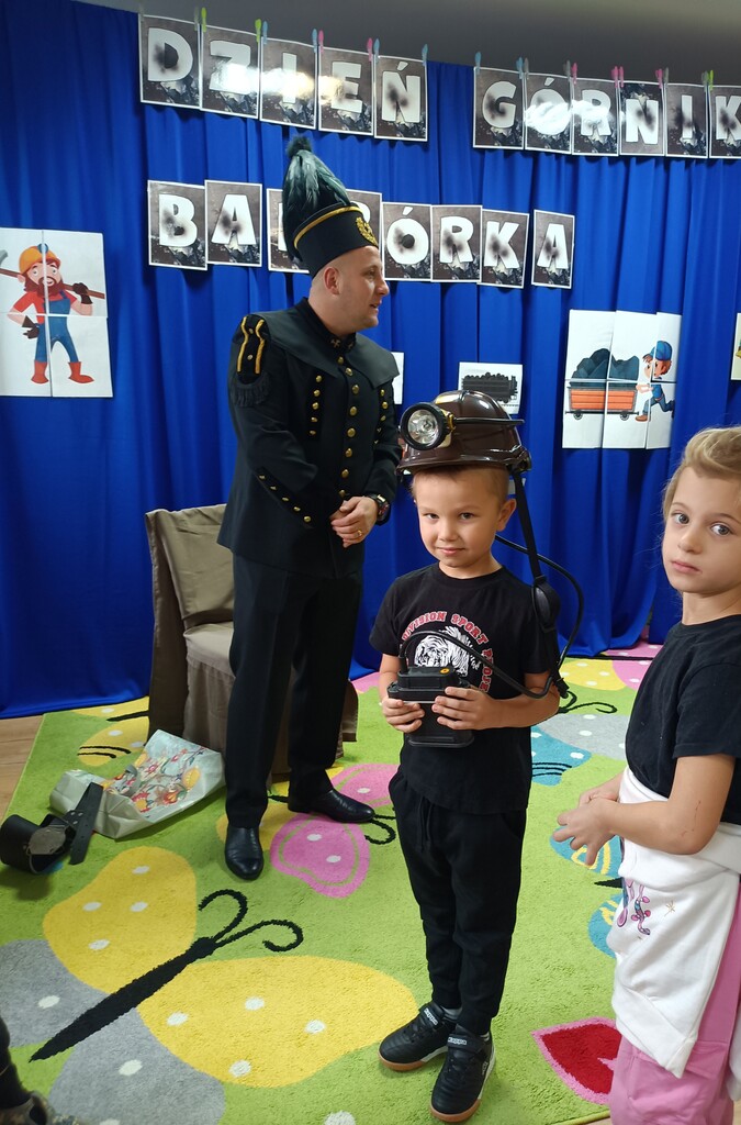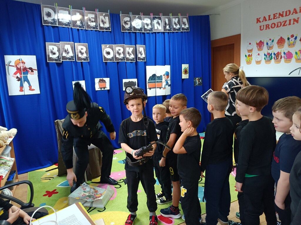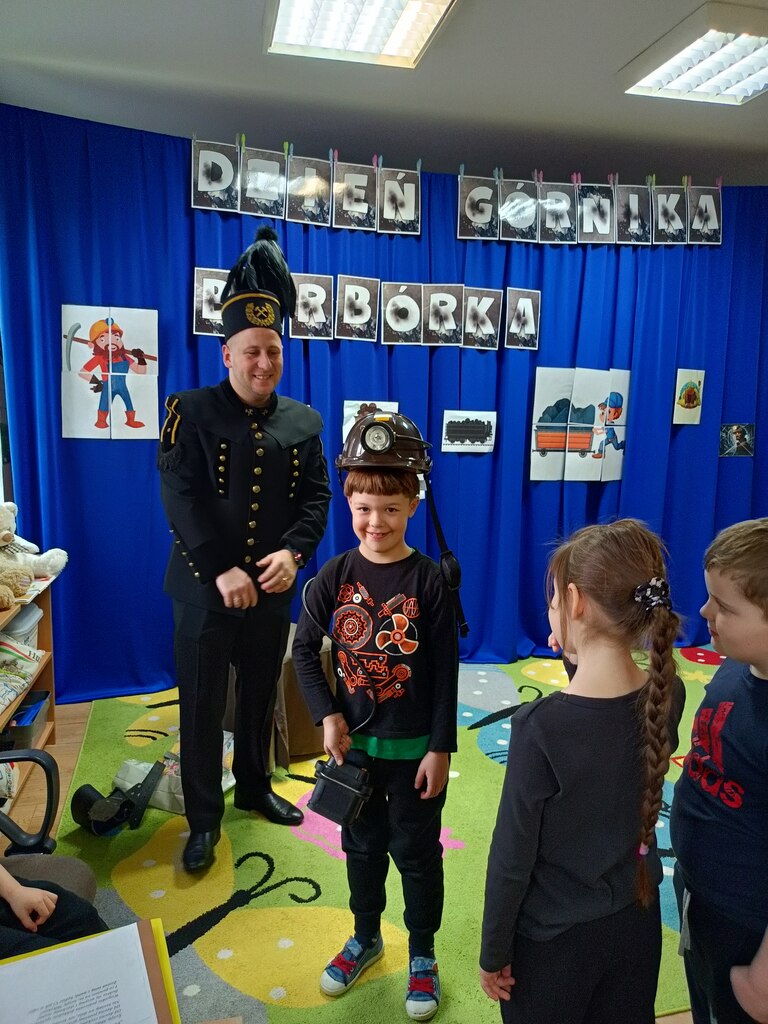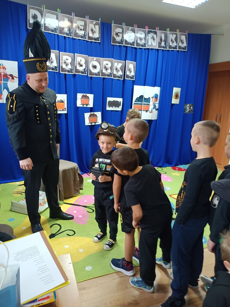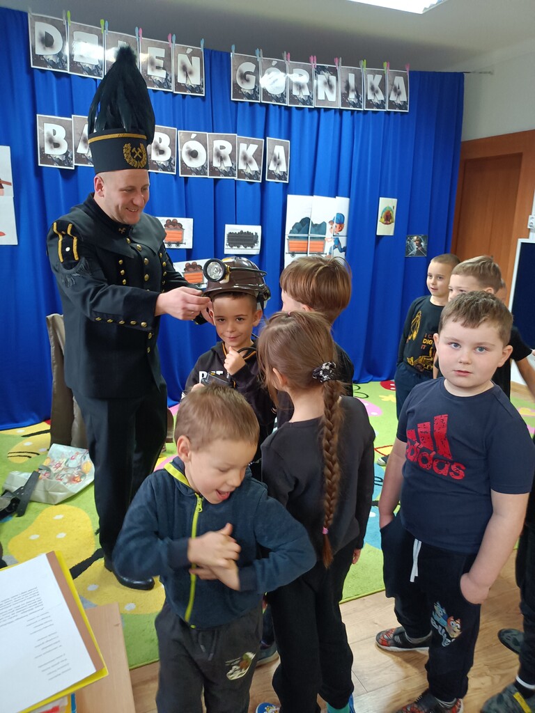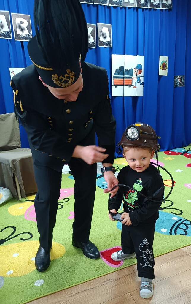 Pan Adrian opowiedział dzieciom o pracy w kopalni, pokazał galowy mundur oraz specjalistyczny sprzęt, którego górnicy używają na co dzień. Na koniec czekała słodka niespodzianka – cukierki rozdane przez naszego gościa.