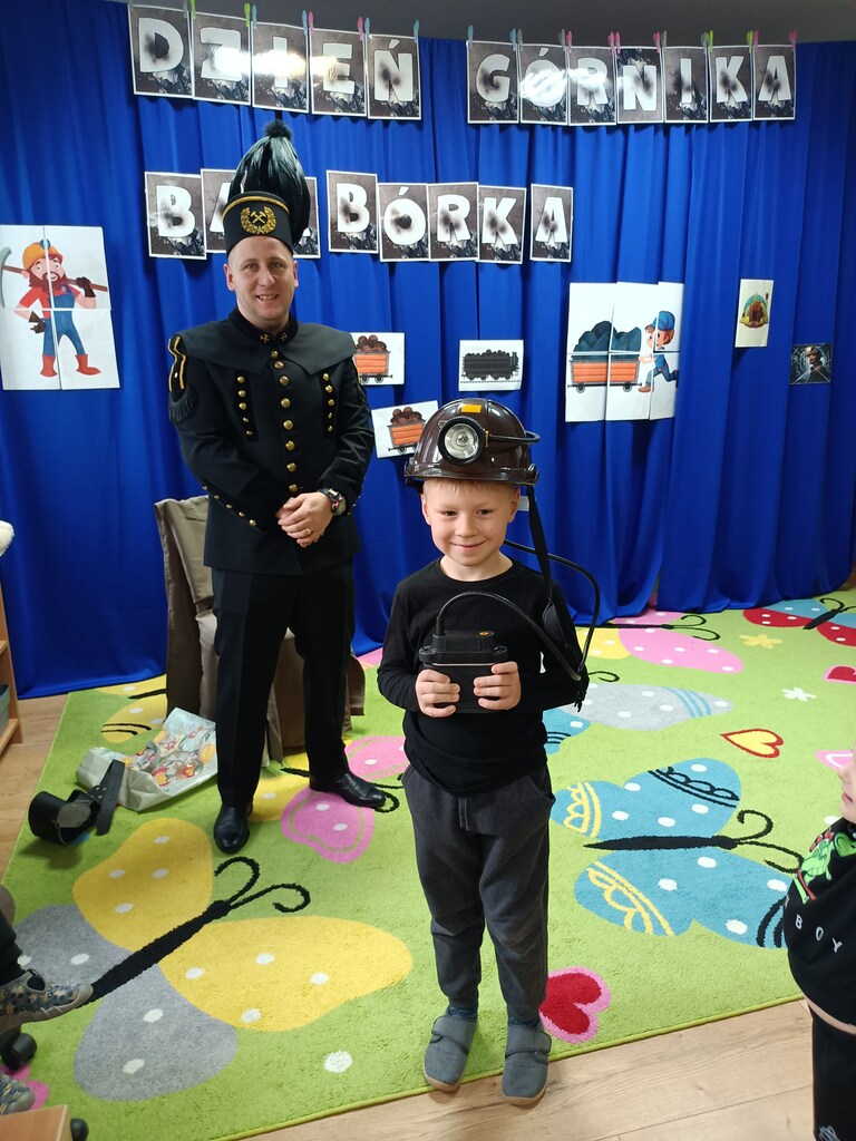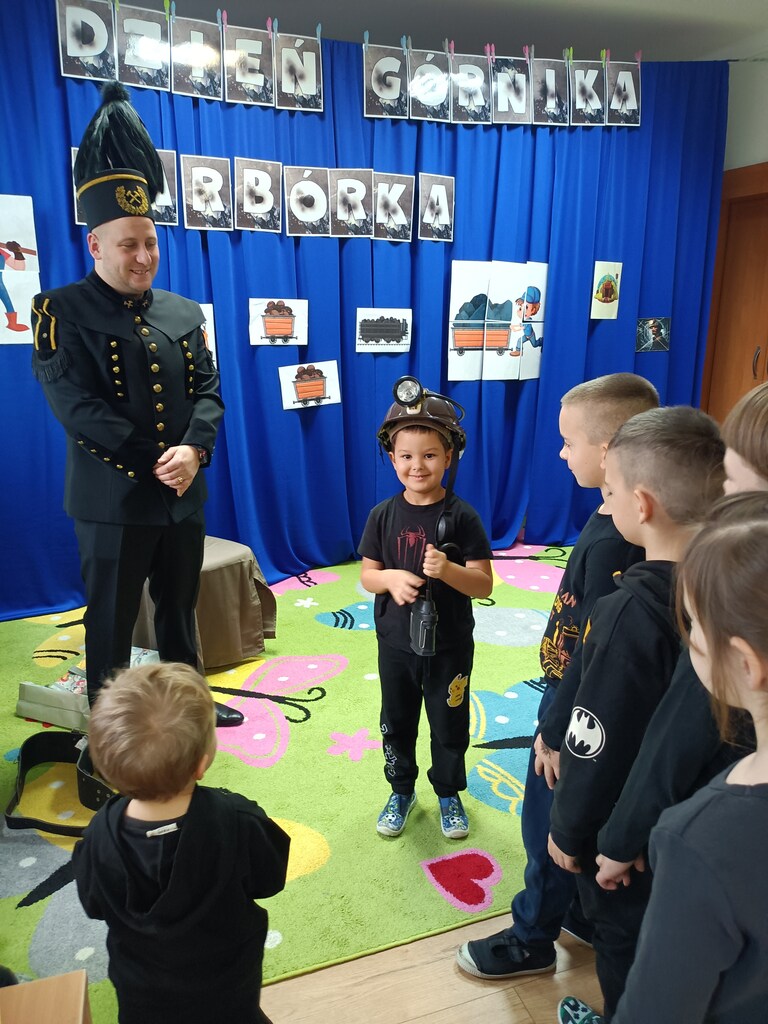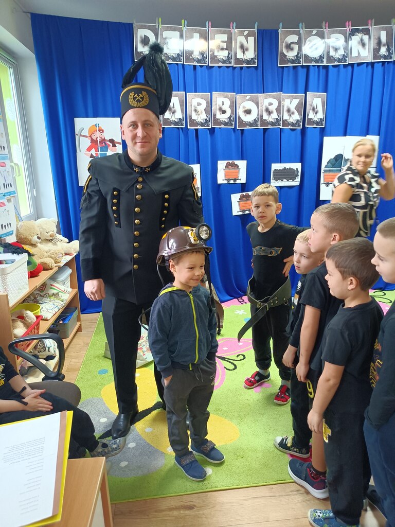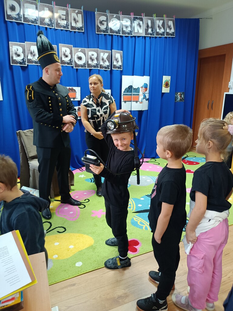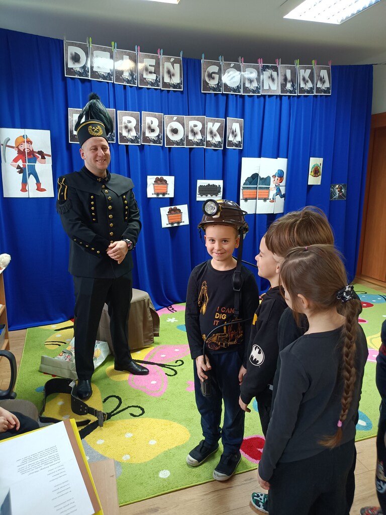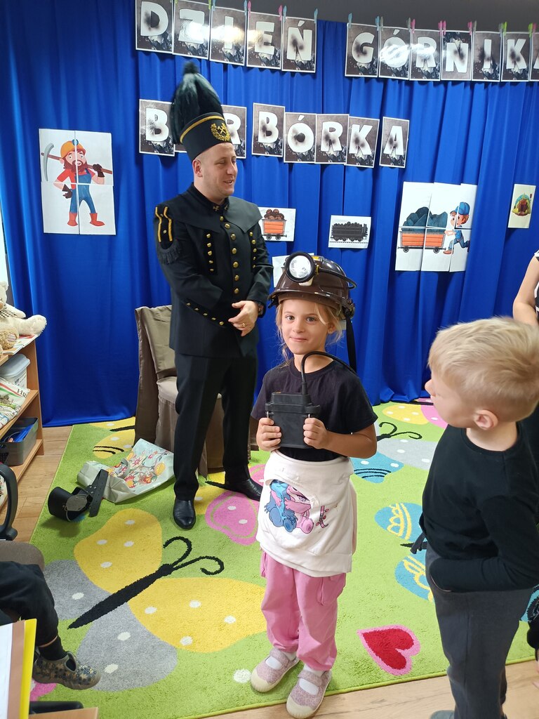 Pan Adrian opowiedział dzieciom o pracy w kopalni, pokazał galowy mundur oraz specjalistyczny sprzęt, którego górnicy używają na co dzień. Na koniec czekała słodka niespodzianka – cukierki rozdane przez naszego gościa.