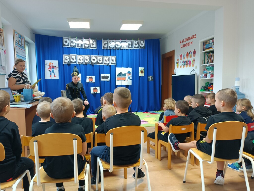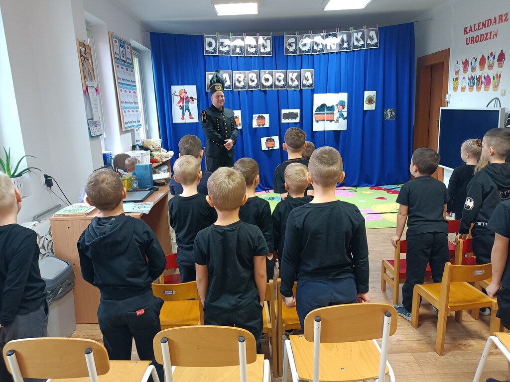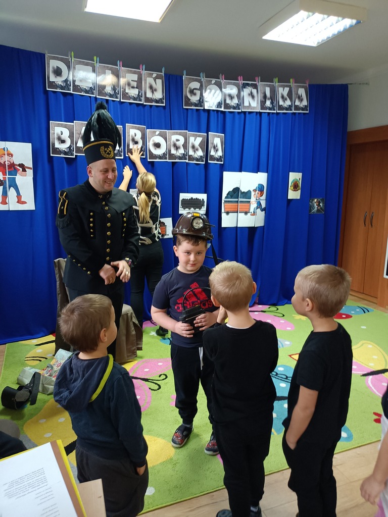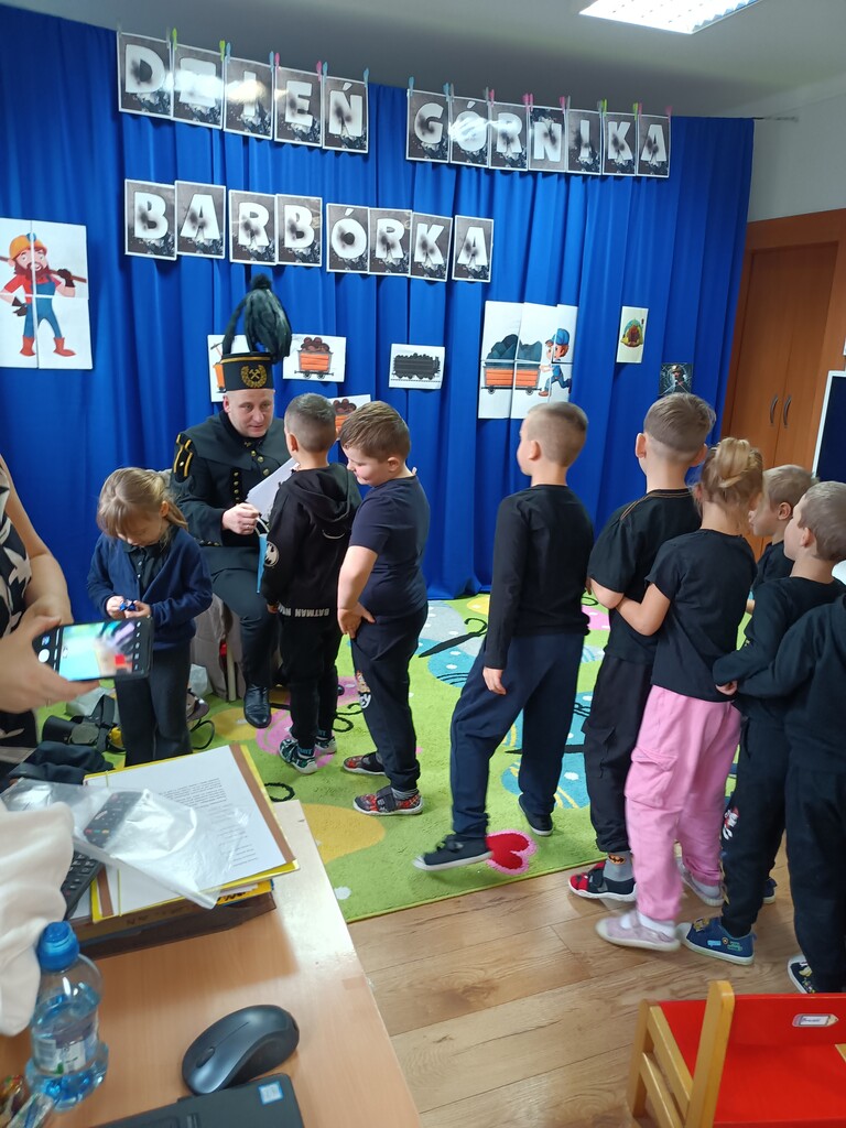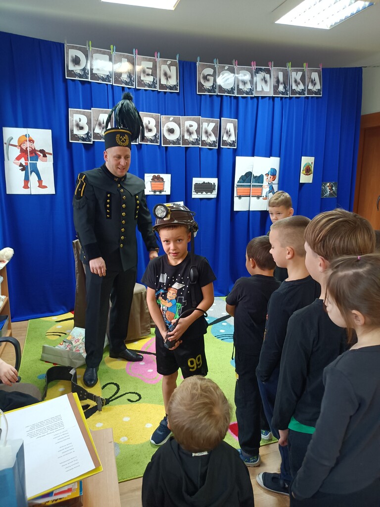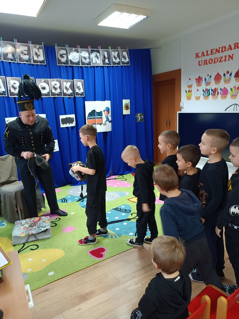 Pan Adrian opowiedział dzieciom o pracy w kopalni, pokazał galowy mundur oraz specjalistyczny sprzęt, którego górnicy używają na co dzień. Na koniec czekała słodka niespodzianka – cukierki rozdane przez naszego gościa.