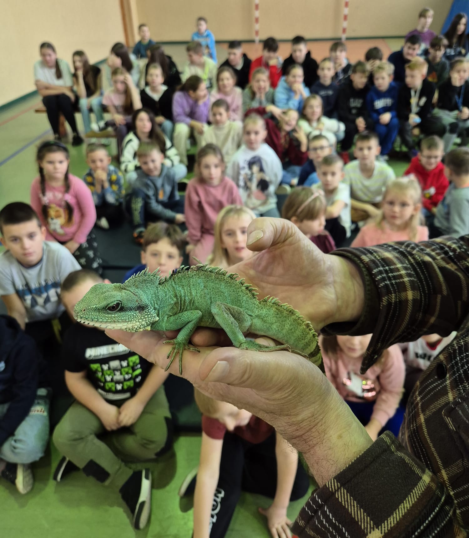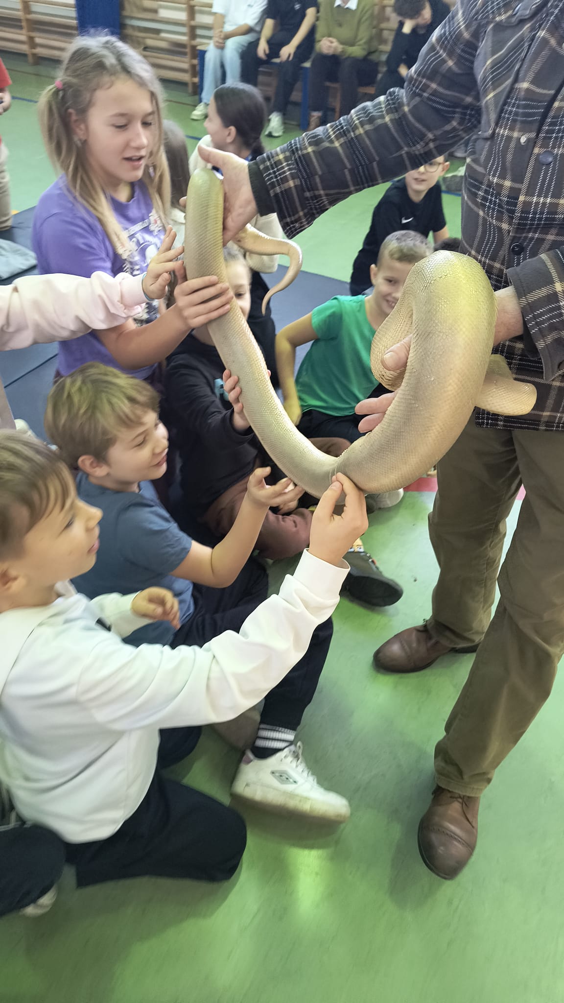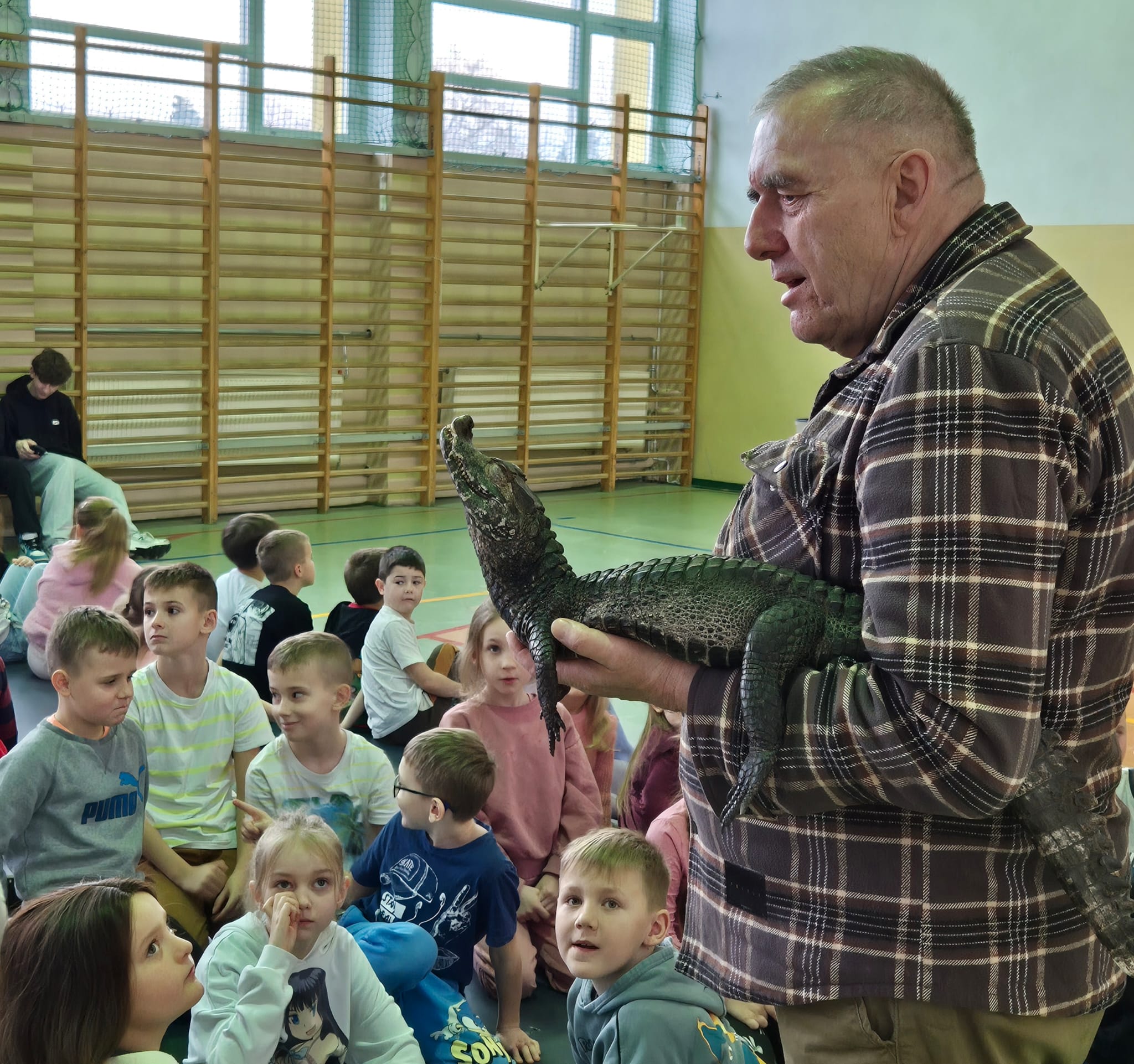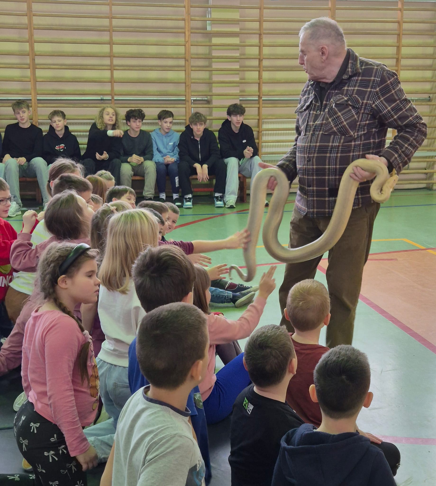 przez Pana Andrzeja Pająka – miłośnika zwierząt i pasjonata świata natury. Podczas spotkania dzieci poznały fascynujące zwyczaje gadów i płazów, które Pan Pająk przywiózł ze sobą do szkoły. Mogły zobaczyć z bliska, a nawet dotknąć niektóre z okazów, co wywołało wiele pozytywnych emocji i ciekawości świata.