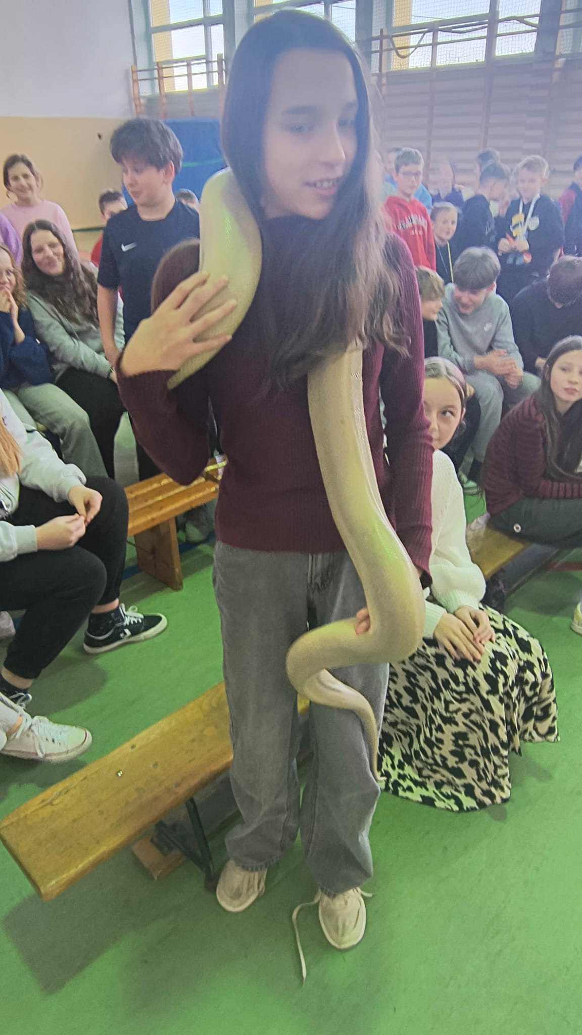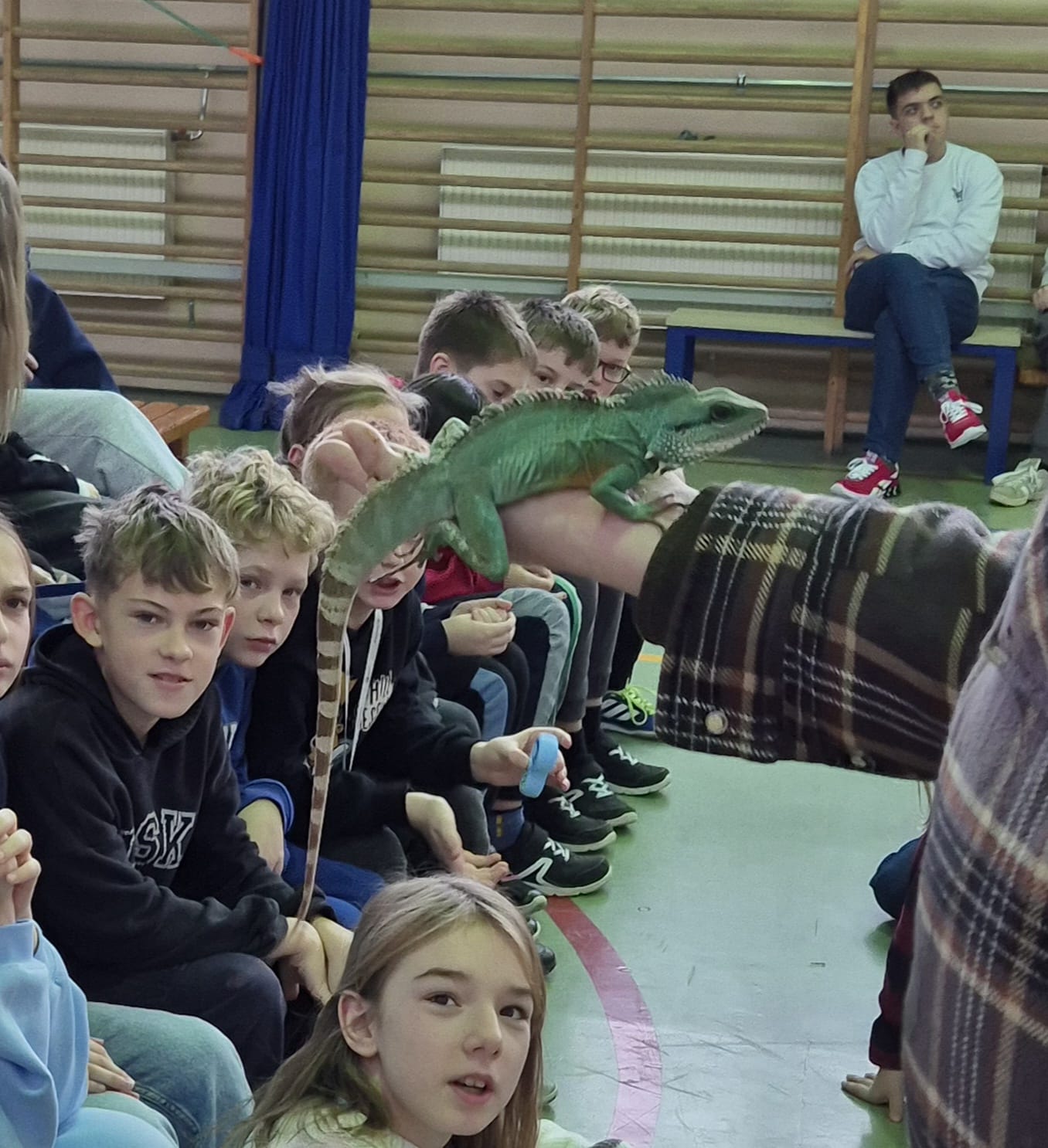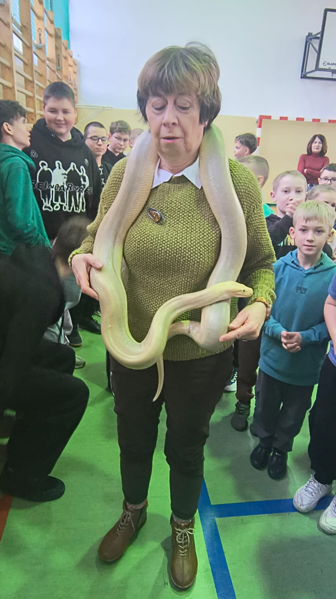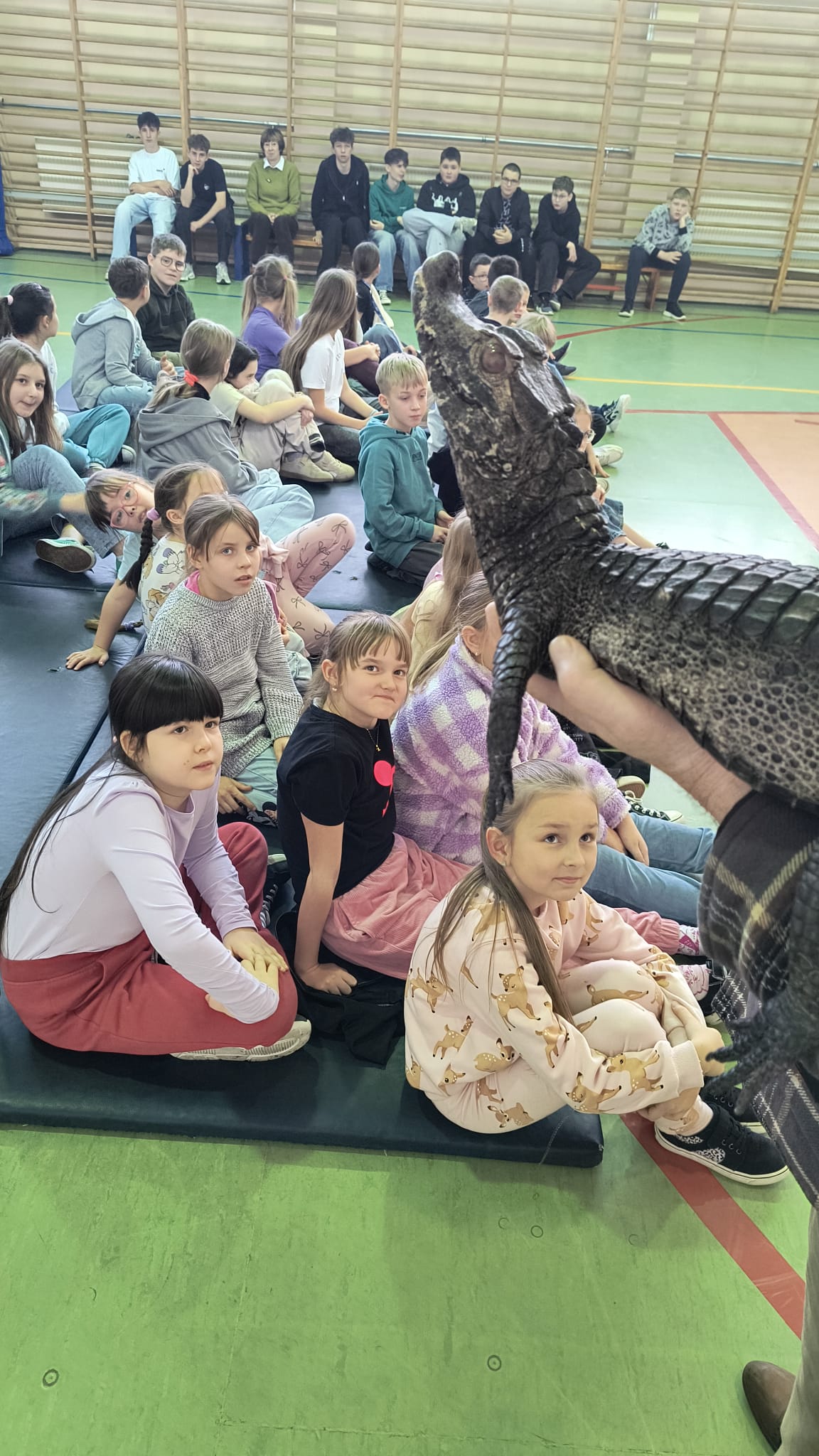 przez Pana Andrzeja Pająka – miłośnika zwierząt i pasjonata świata natury. Podczas spotkania dzieci poznały fascynujące zwyczaje gadów i płazów, które Pan Pająk przywiózł ze sobą do szkoły. Mogły zobaczyć z bliska, a nawet dotknąć niektóre z okazów, co wywołało wiele pozytywnych emocji i ciekawości świata.