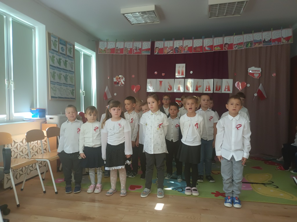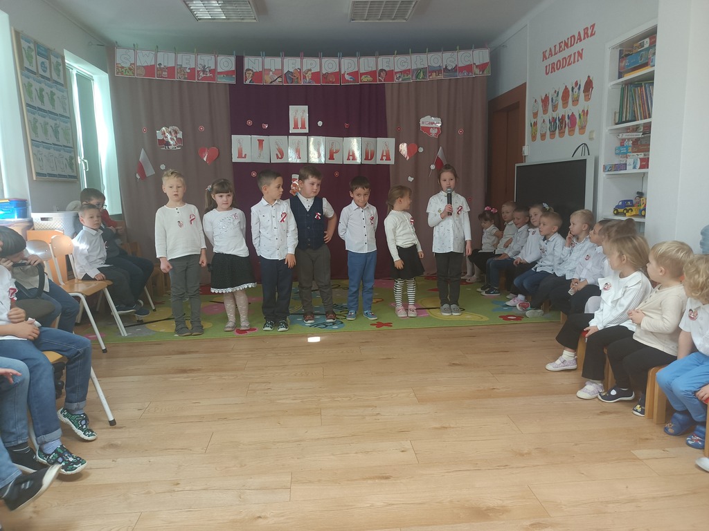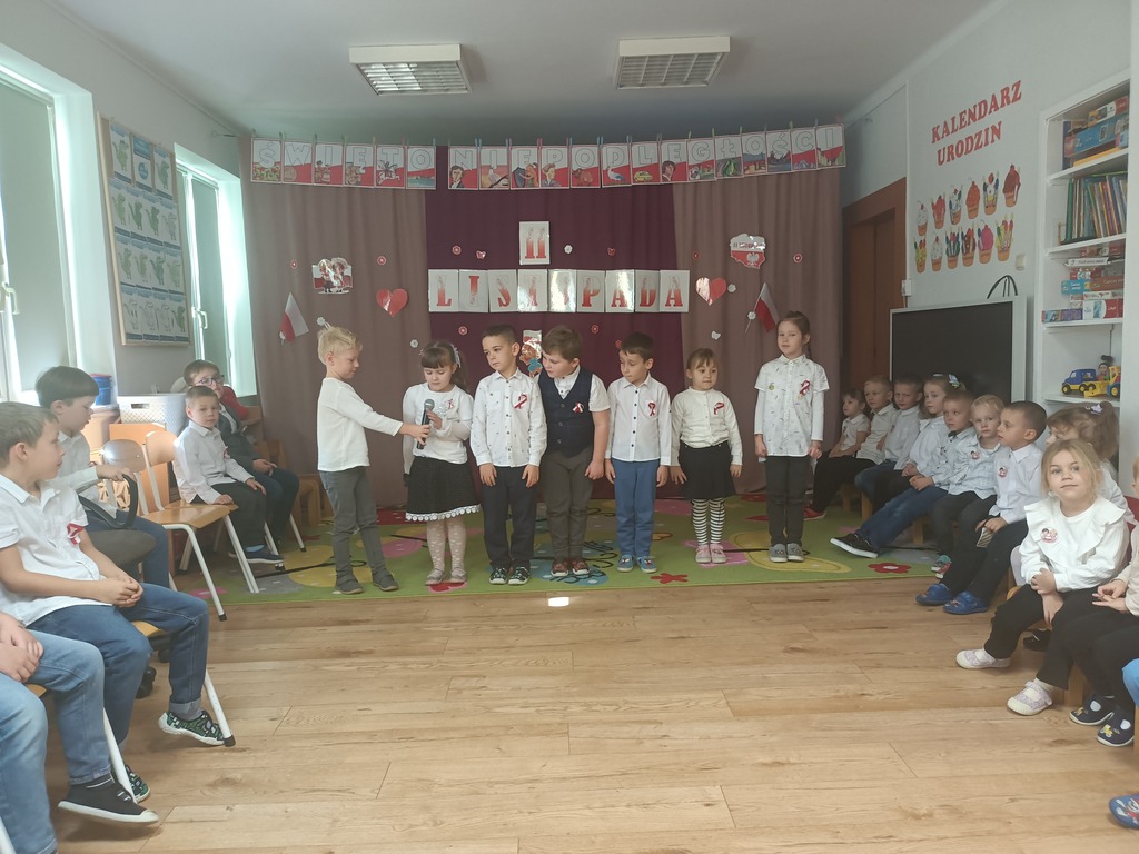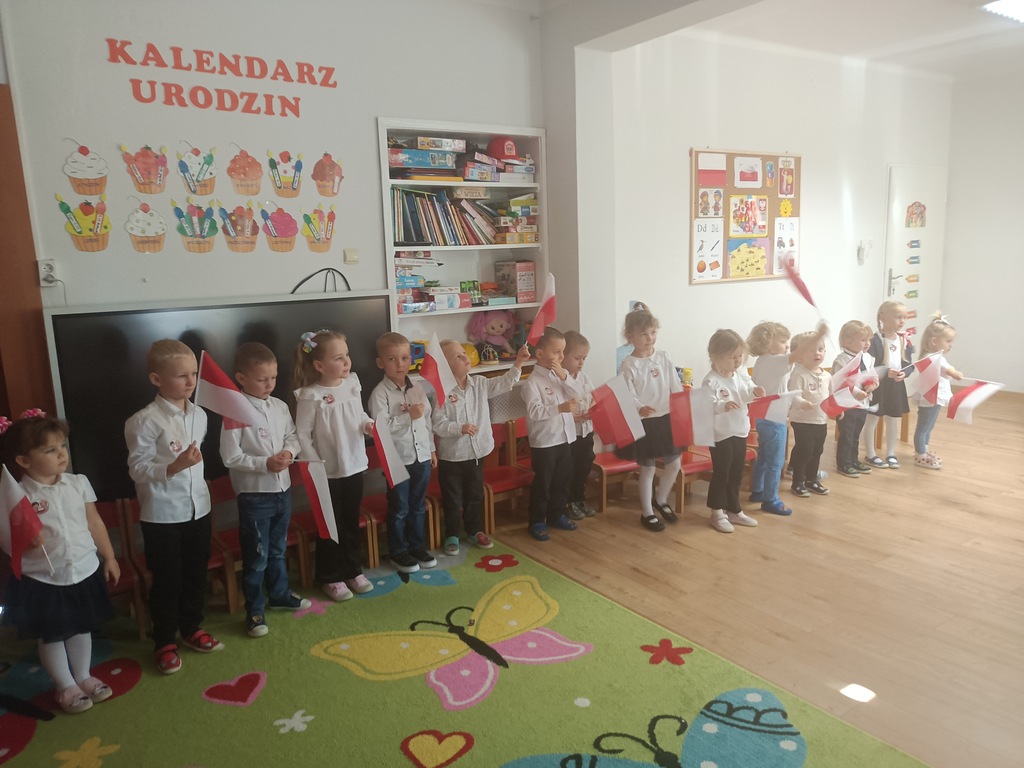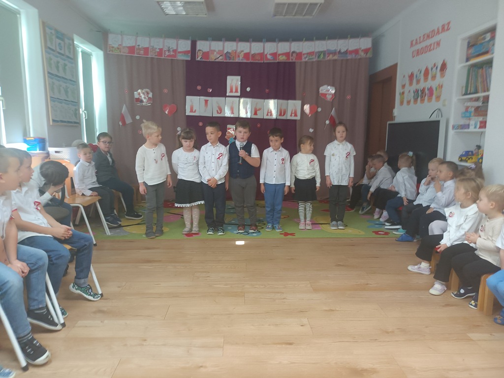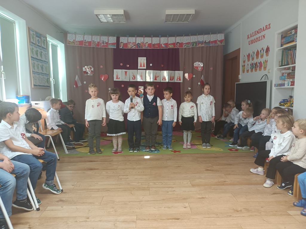 Podczas uroczystości przedszkolaki zaprezentowały wiersze i piosenki o Polsce. Starszaki pięknie opowiadały o tym, czym jest Polska, a maluszki wzruszająco powiedziały wiersz „Kto ty jesteś?”. Następnie maluszki zaśpiewały w kole piosenkę „Jesteśmy Polką i Polakiem”, a potem wszyscy z dumą i na baczność odśpiewaliśmy „Mazurek Dąbrowskiego”. Na zakończenie grupa starsza zaprezentowała piosenkę „Orzeł Biały” wraz z improwizacją ruchową.