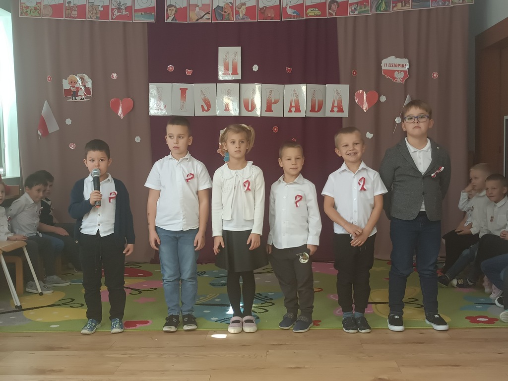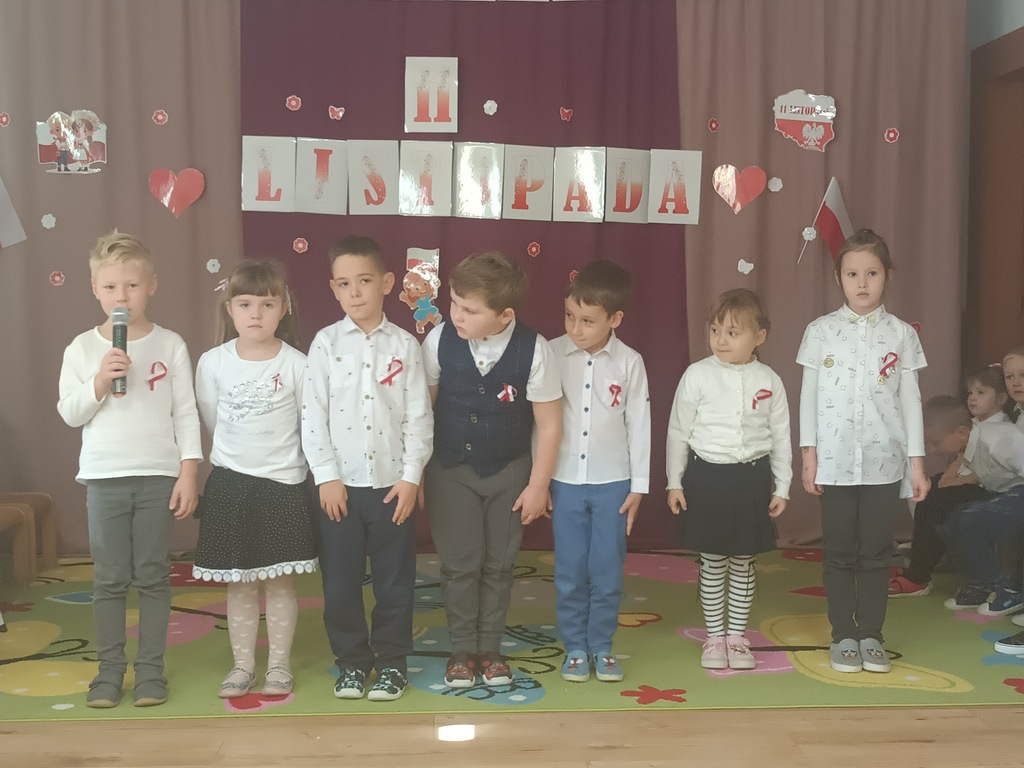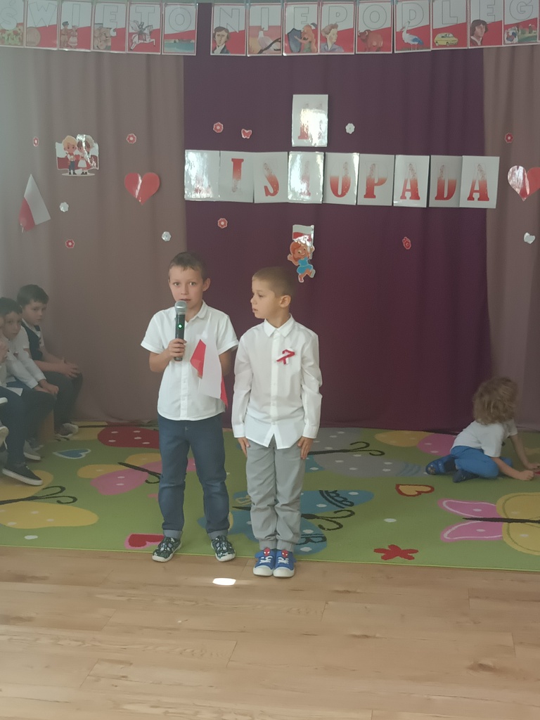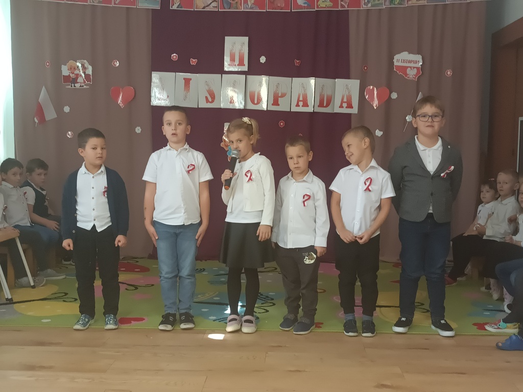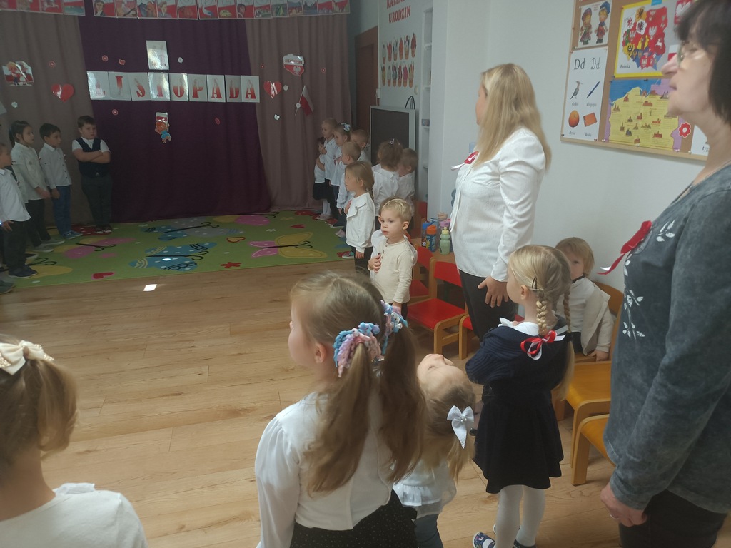 Podczas uroczystości przedszkolaki zaprezentowały wiersze i piosenki o Polsce. Starszaki pięknie opowiadały o tym, czym jest Polska, a maluszki wzruszająco powiedziały wiersz „Kto ty jesteś?”. Następnie maluszki zaśpiewały w kole piosenkę „Jesteśmy Polką i Polakiem”, a potem wszyscy z dumą i na baczność odśpiewaliśmy „Mazurek Dąbrowskiego”. Na zakończenie grupa starsza zaprezentowała piosenkę „Orzeł Biały” wraz z improwizacją ruchową.