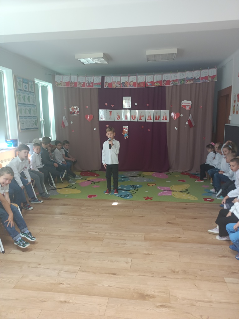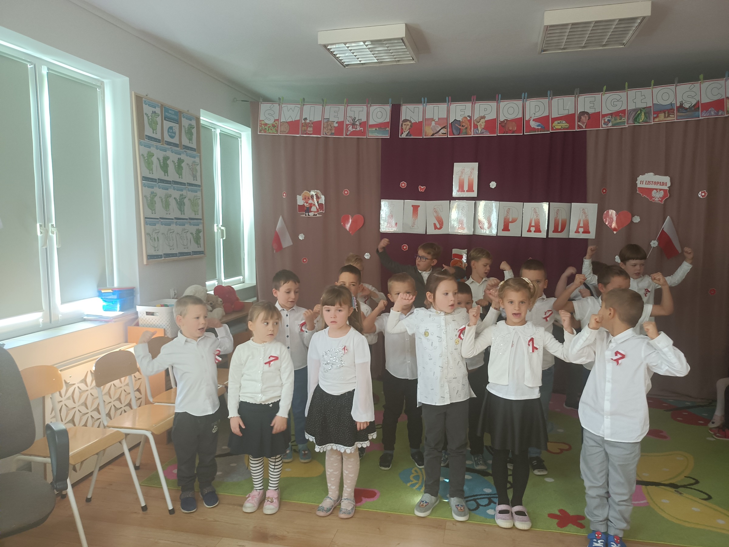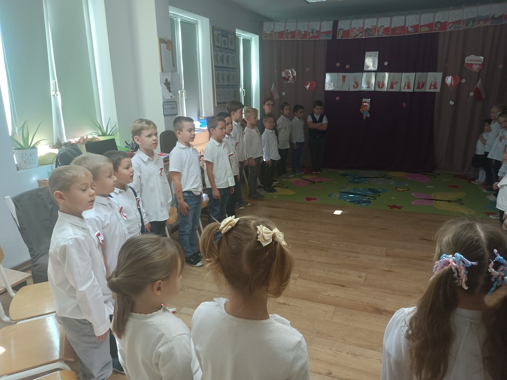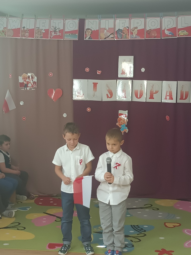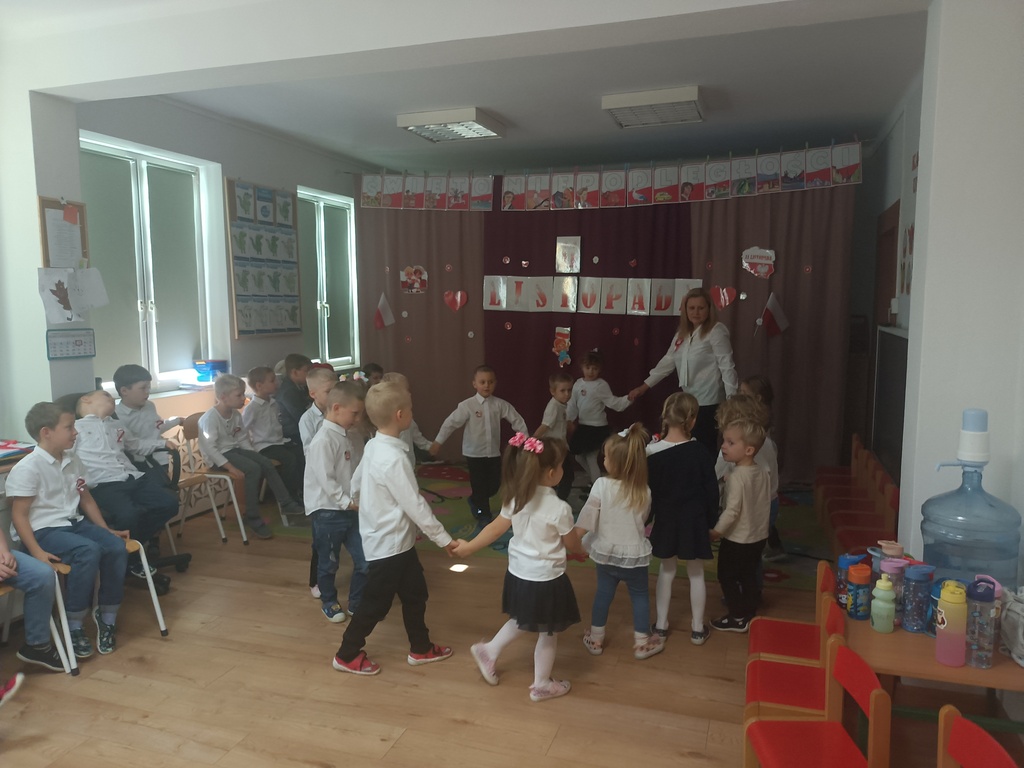 Podczas uroczystości przedszkolaki zaprezentowały wiersze i piosenki o Polsce. Starszaki pięknie opowiadały o tym, czym jest Polska, a maluszki wzruszająco powiedziały wiersz „Kto ty jesteś?”. Następnie maluszki zaśpiewały w kole piosenkę „Jesteśmy Polką i Polakiem”, a potem wszyscy z dumą i na baczność odśpiewaliśmy „Mazurek Dąbrowskiego”. Na zakończenie grupa starsza zaprezentowała piosenkę „Orzeł Biały” wraz z improwizacją ruchową.