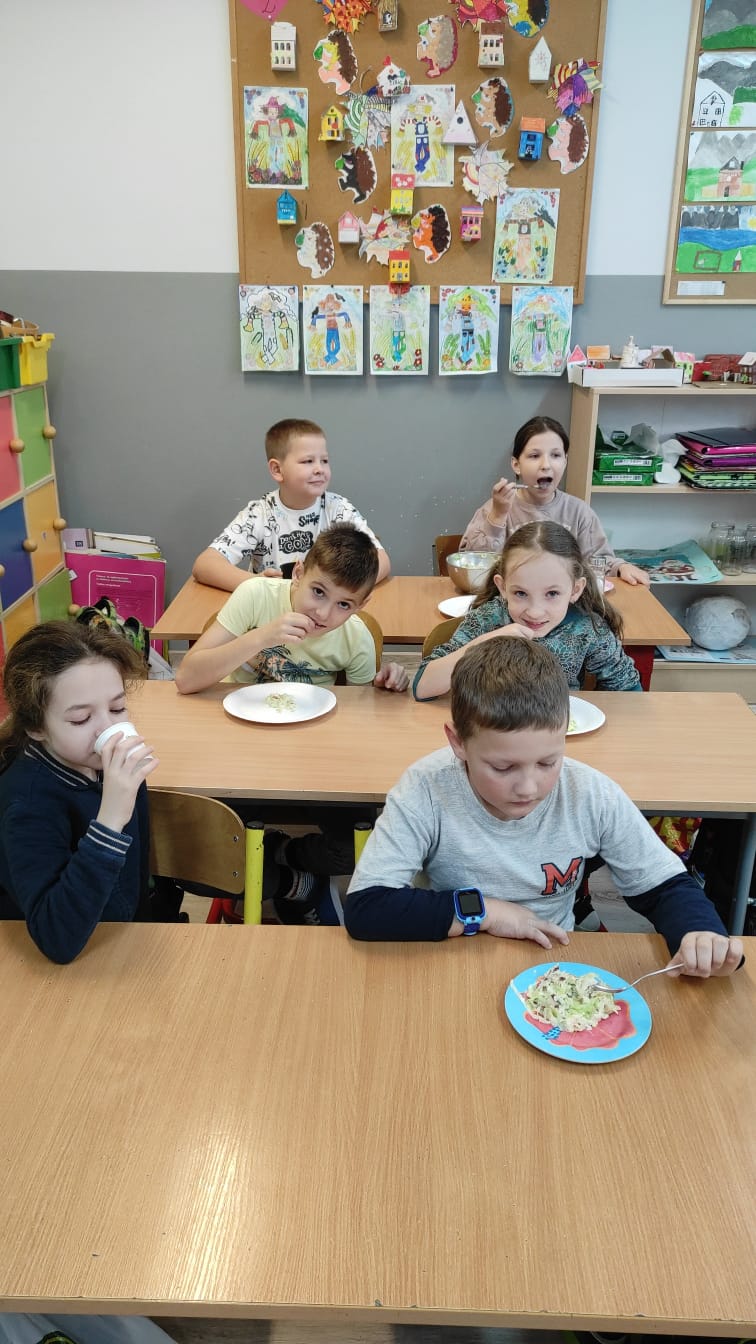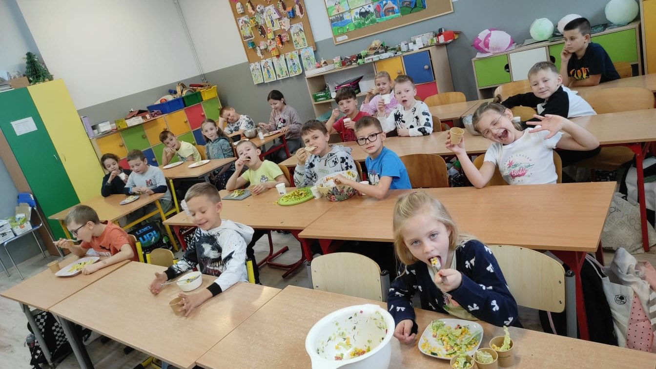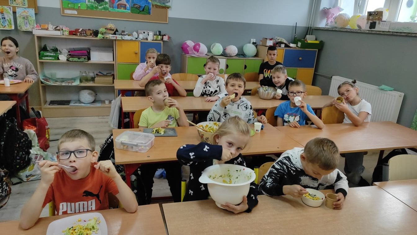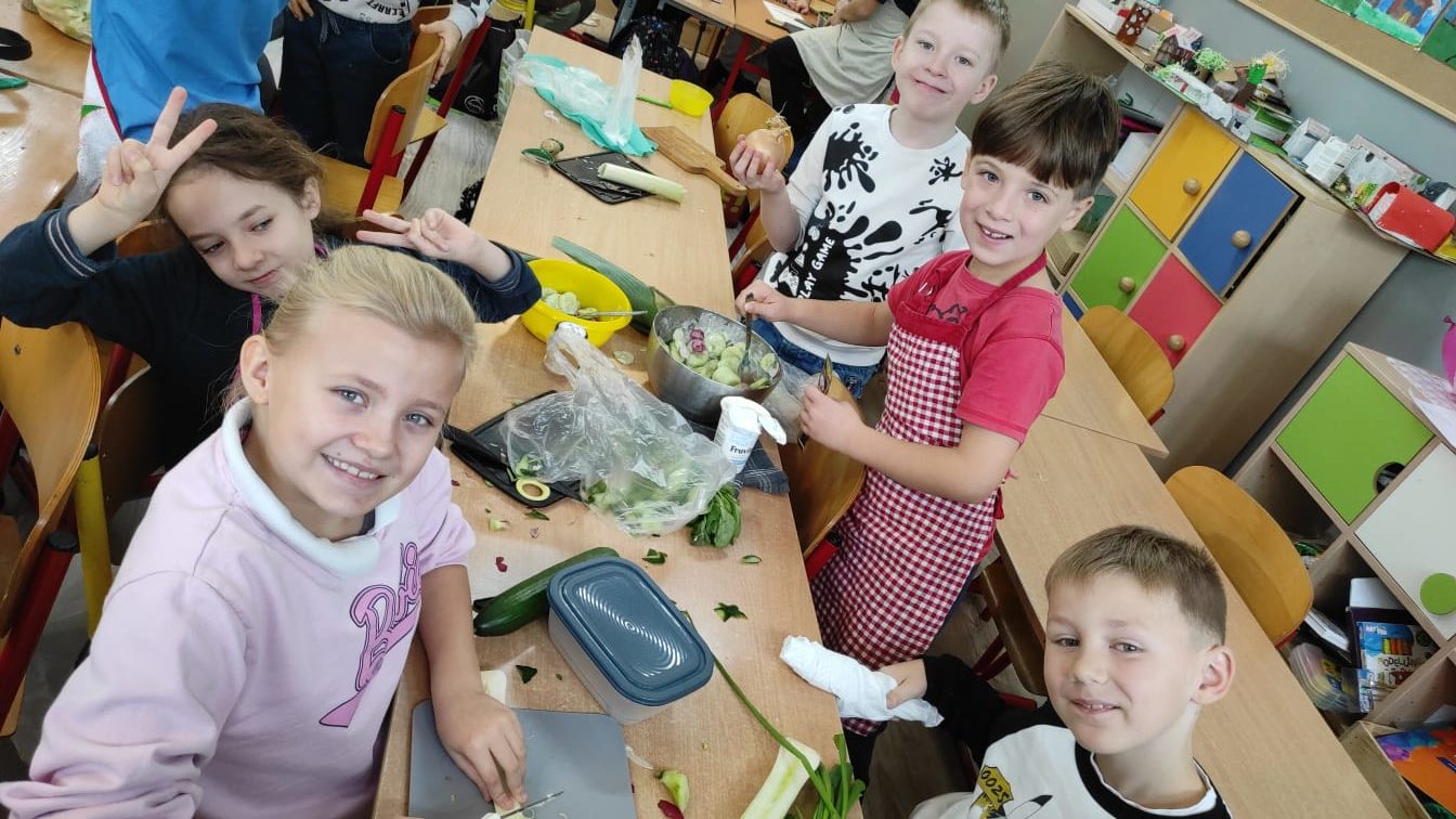 Gotowe surówki były kolorowe, pachnące i bardzo zdrowe – a przede wszystkim przygotowane własnoręcznie, co sprawiło uczniom wiele radości. Na koniec wspólnie omówiliśmy, jak można komponować zdrowe posiłki i dlaczego warto ograniczać słodycze i fast foody.